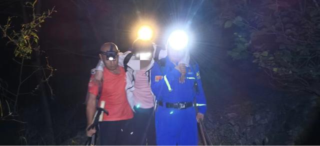 上山途中岔路很多,经验丰富的队员们需不断修正方向。22时许,队员们找到3名被困者,当时3人处在一处3米高的断崖下,询问得知,他们身体状况无大碍,只是有一名被困者左膝盖有点受伤,队员们赶紧把带来的食物和水发给他们,同时想办法怎么才能把三人安全转移到断崖上方。