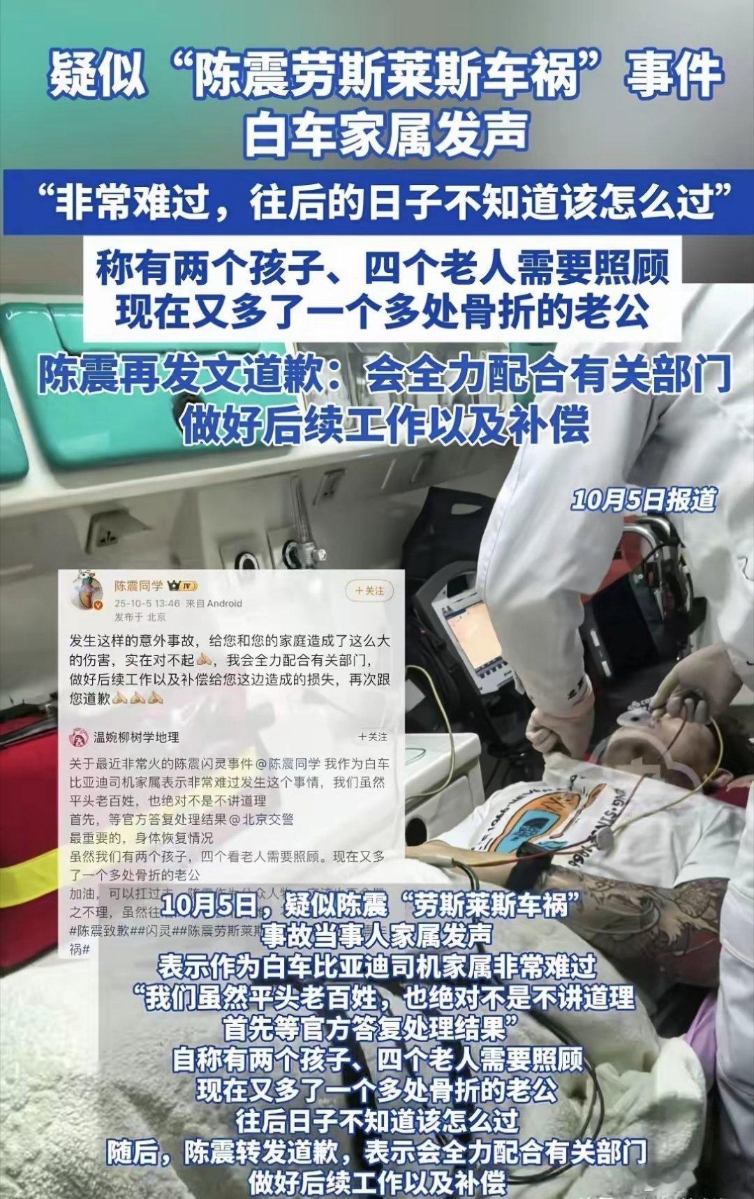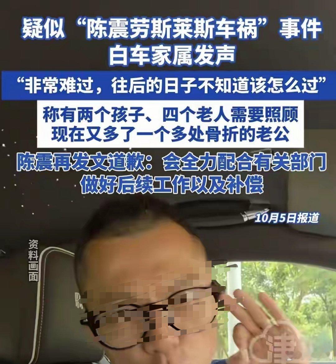 陈震车祸受伤司机家属发声总结一下受伤司机家属的发声,最大的幸运就是人没生命危险,2个孩+4个老人都要用钱,现在又多了一个被撞骨多处骨折的老公,陈大网红你看着办吧。热点观点