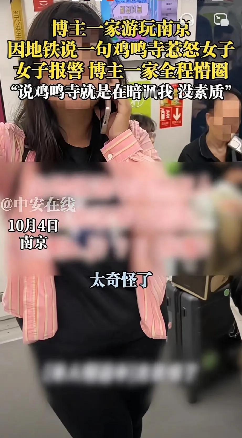 笑不活了,这是谁家的小公举? 网友一家去南京游玩。在乘坐地铁的过程中。家人聊天,说到鸡鸣寺,结果说者无意,听者有心。 旁边一个小公举听到网友说了“鸡鸣寺”三个字,就受不了了,说网友一家在暗讽自己,于是报了J要求网友一家必须和她一起下车。 网友一脸懵,真是人在地铁坐,锅从天上来,云里雾里就被扣上了一个暗讽的帽子。 网友于是提出质疑,说我们说话,哪里暗讽你了? 小公举却说,我要是说鸭,你难道不觉得是说你吗? 天哪![捂脸]