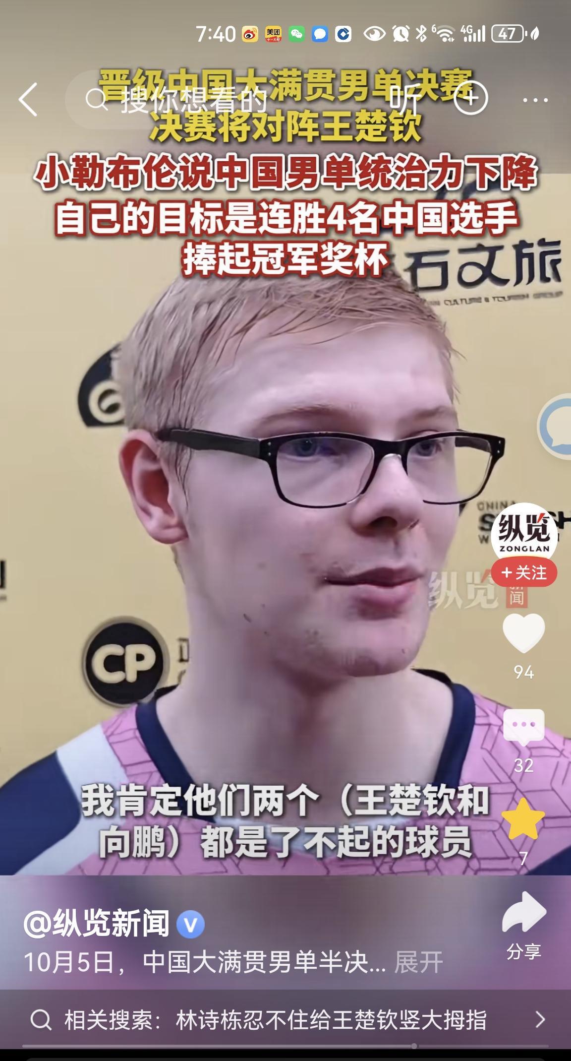 勒布伦赢林诗栋后一番话值得警惕[捂脸] 昨天,勒布伦两战,一胜一负。打败林诗栋,惨败王楚钦。冰火两重天! 赢了林诗栋,一番话: 中国男单统治力下降,自己的目标是连胜4名中国选手,捧起冠军奖杯。 没想到,接下来和王楚钦对阵,就被打脸。 王楚钦拖着疲惫之身走上战场,满血复活,一直碾压对手,没有给勒布伦赢球的机会。 4:0完胜,零封对手,勒布伦惨败,他的冠军梦碎了一地! 赛后,王楚钦接受记者采访,说出来取胜的原因:为了捍卫中国乒乓的荣誉! 打败勒布伦的,是王楚钦精湛的球技和顽强的毅力,更有心中的责任与担当! 外国小子,哪里懂王楚钦的大格局! 这番话,虽然有点狂,实话逆耳,但值得三思警惕。国乒男儿当自强,捍卫国乒荣誉必须强! #法国小将勒布伦# #勒布伦爆冷# #视频转图文大赛##头号创作者激励计划#