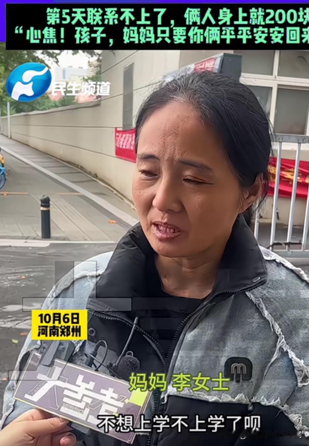 叛逆期的孩子太让人操心了 14岁的闺女因为学习不好,不想上学了,爸爸生气,把她手机给摔了。双胞胎的姐姐觉得爸爸对妹妹太武力,姐妹俩一起离家出走,妈妈急坏了,赶紧从周口到郑州一条街一条街的寻找两姐妹。 现在已经五天了,两人身上就只有200块,妈妈十分担心她俩,希望她俩赶紧联系父母,赶紧回家。 现在的孩子太难管教了。