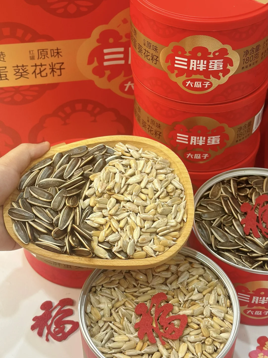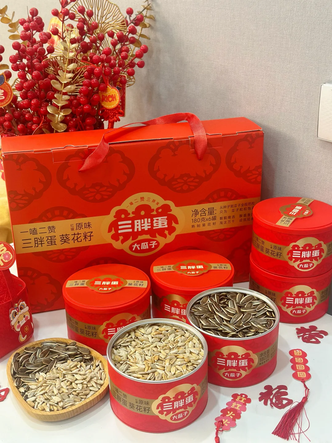 年夜饭结束后,大家都吃得饱饱的,这时候就需要来点轻松的小零嘴,边吃边唠唠家常。今年我给家人准备了三胖蛋瓜子礼盒,一拿出来就吸引了全家人的目光,喜庆的新年红搭配金色,看起来精美又高级,往桌上一放,年味儿就更浓啦!