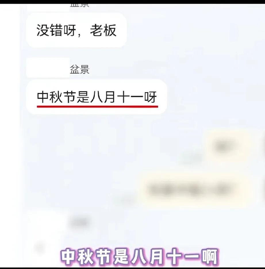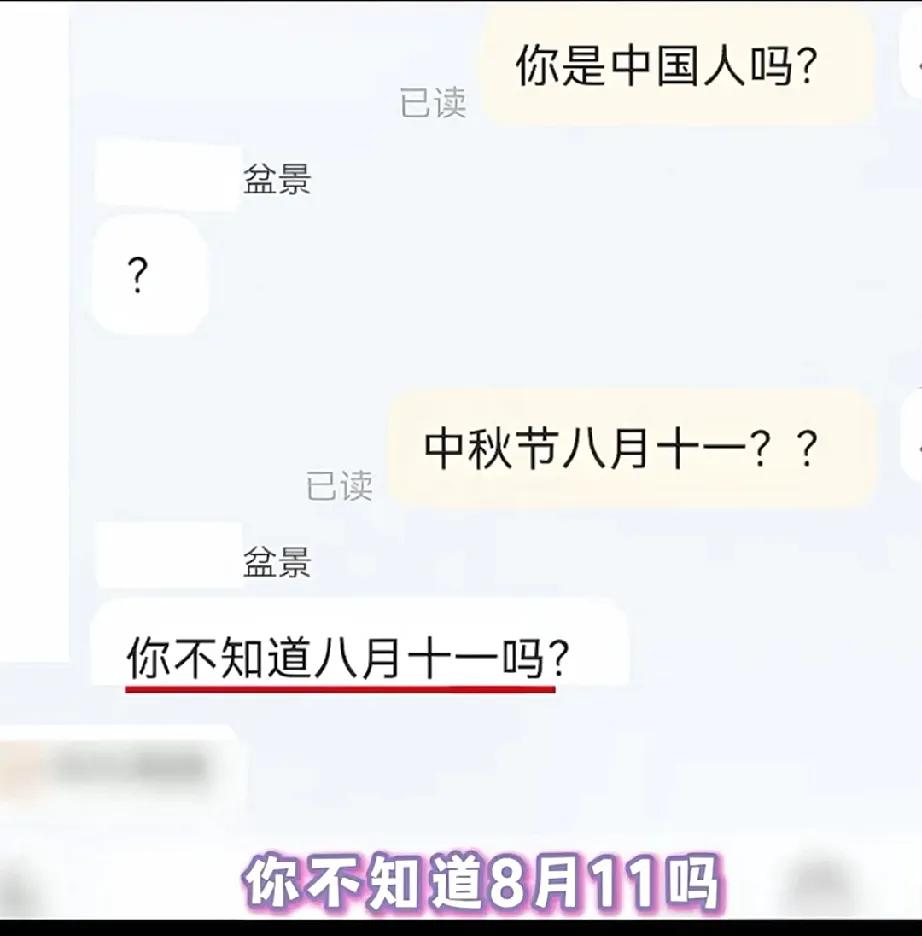 蹲一个后续 网友在网上买了一盆盆栽,一开始,网友还觉得商家怪好,送了一张中秋节的贺卡,一看贺卡。网友不淡定了,贺卡上印着,八月十一中秋节。 于是网友处于好奇找到商家客服。问了这个问题,结果商家说中国的中秋节就是农历八月十一啊!你不知道吗? 网友都震惊了!从小到大,就是八月十五月儿明,吃月饼,赏月,哪里成了八月十一? 网友把这件事发布到了网上,没想到商家很快联系网友,说卡片是找设计师设计的,是排版问题,前言不搭后语…… 而且,8月11是日本的山之日!!细思极恐……