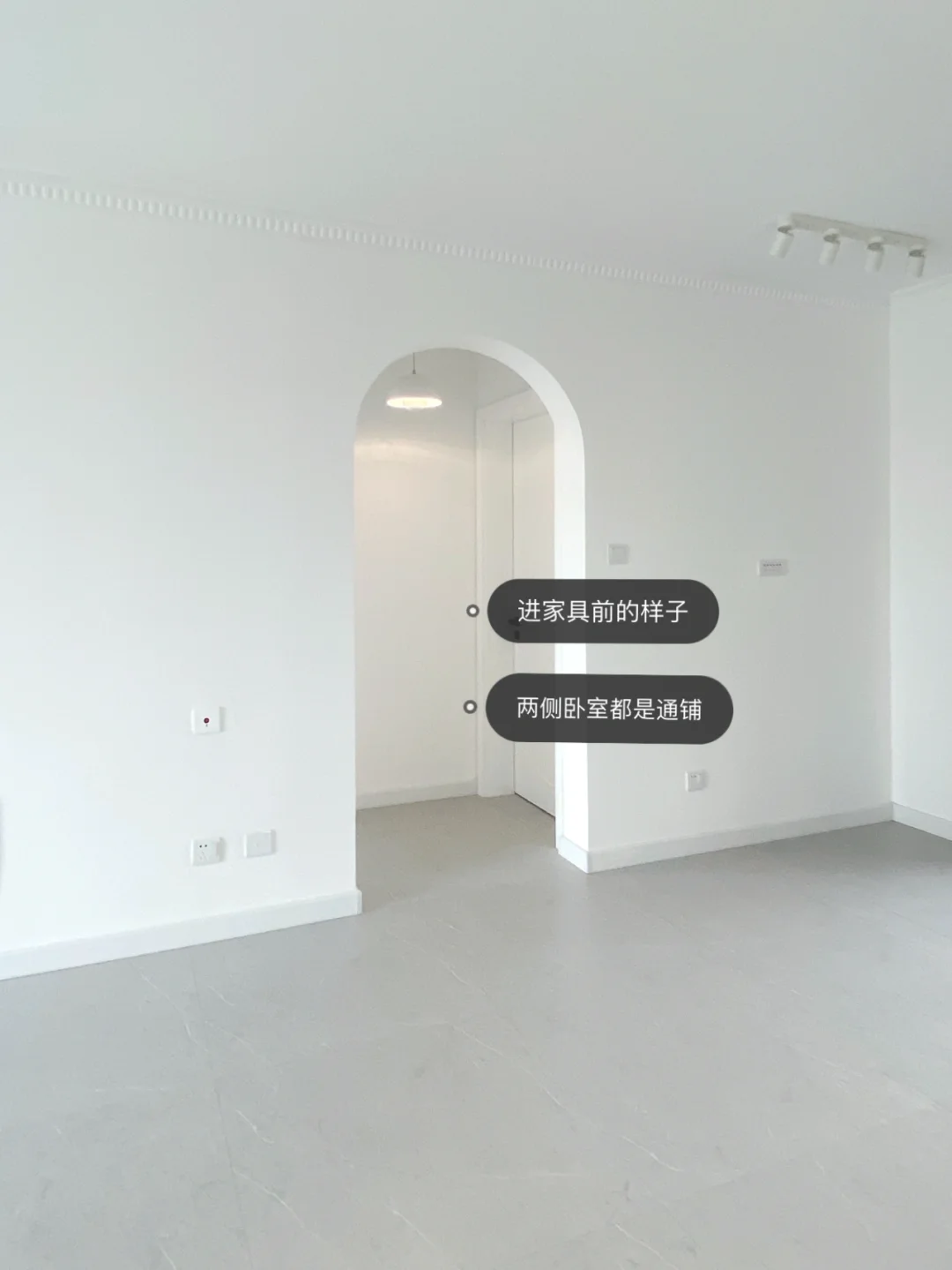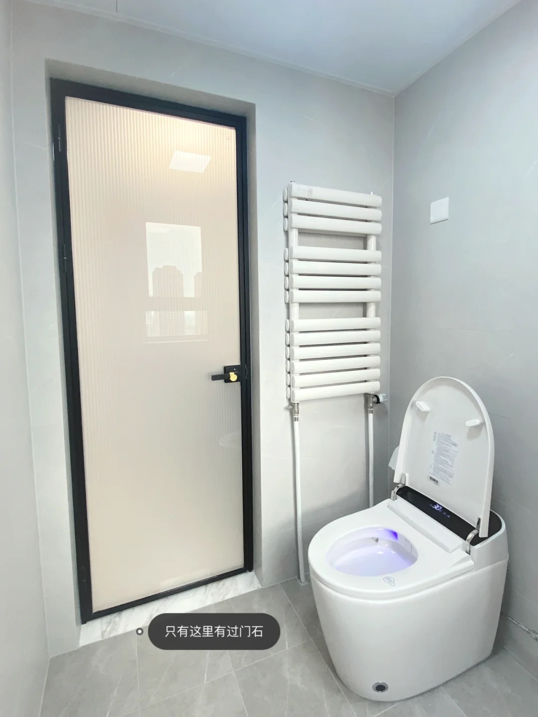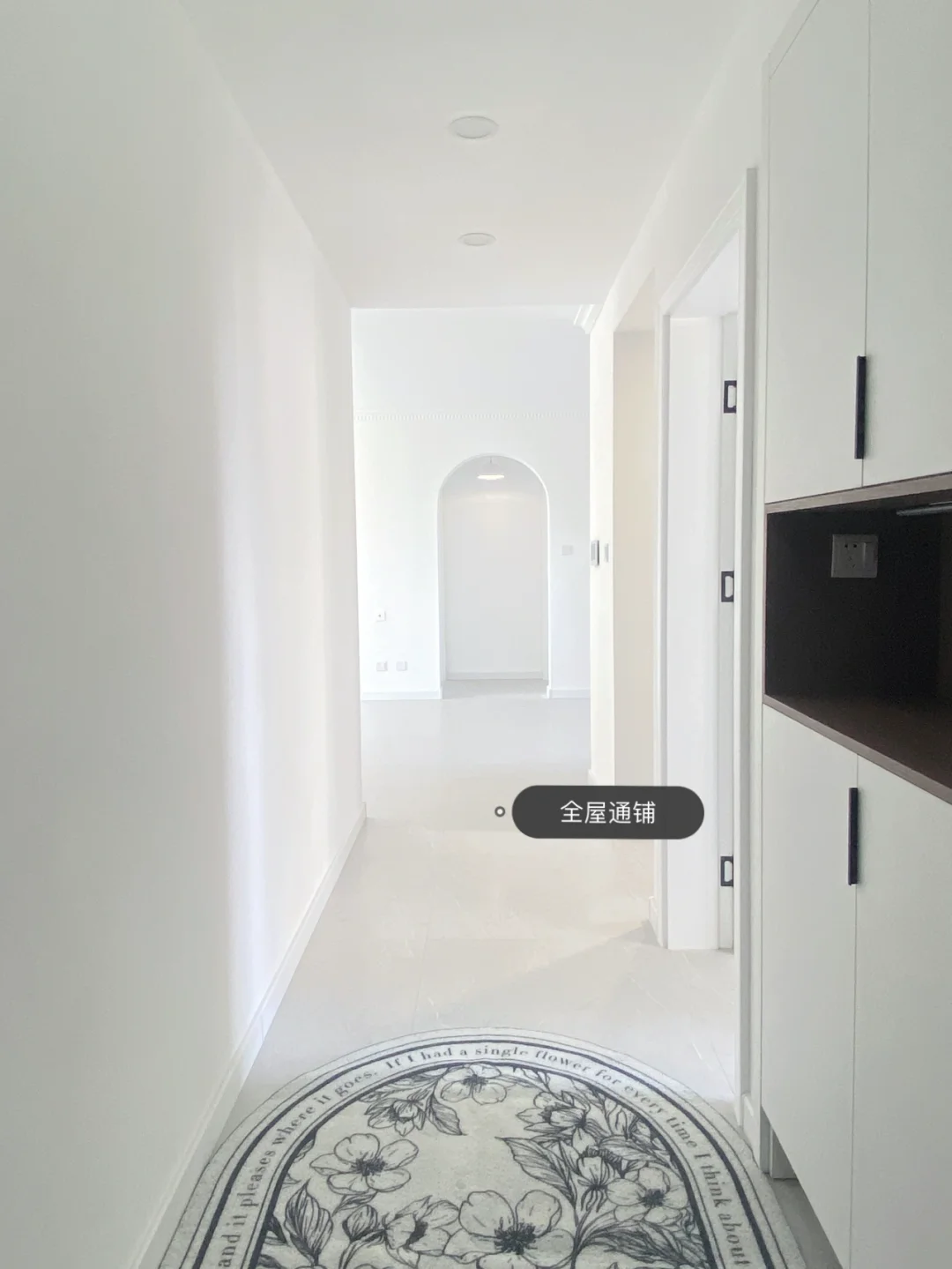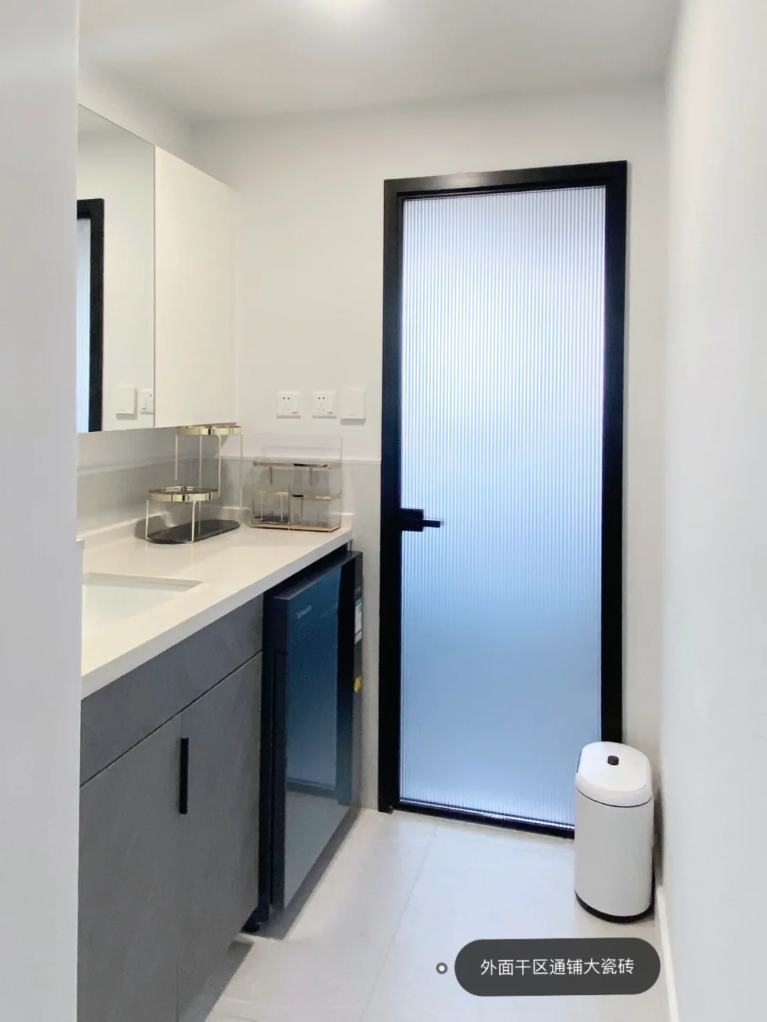 除两个卫生间湿区有过门石(因为需要和外面大瓷砖衔接,并且有防水落差),客厅到卧室、客厅到卫生间干区都无过门石,好处是视觉上统一,不会分割空间