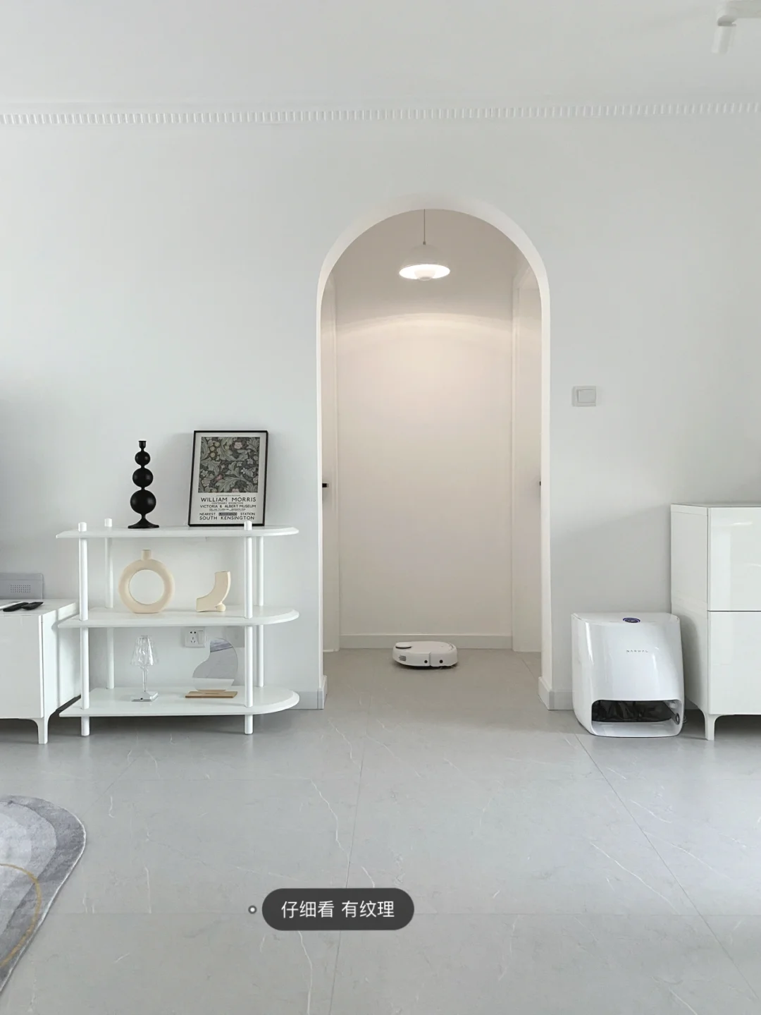 ✔️选择纹理很少的,因为瓷砖通铺后花纹连在一起会更明显,纹路越少越有“自流平”的无缝效果