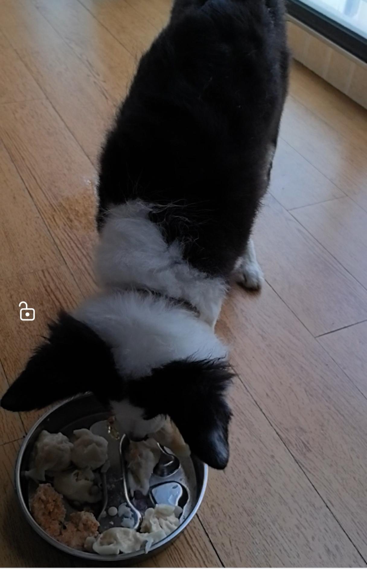怎样改掉毛孩子吃饭时狼吞虎咽的臭毛病? 哎,我真是服了我家边牧途途吃饭时狼吞虎咽的样子。 不管吃啥,都跟饿牢里放出来的一样,只要喊一声吃饭啦,它保证第一个冲出来,端端正正的坐在那里等。任何事情都干扰不了它等吃饭的急迫心。 昨天打完针换完药,就去超市给途途买吃的。看有博主说可以给狗狗吃饺子,那干脆给它包点饺子,还省事一点。于是,买好了鸡胸肉、纯瘦肉、胡萝卜、大白菜、饺子皮,回家给它包饺子咯。 把所有食材洗干净沥干水分,就开始用绞肉机绞,打了两个生鸡蛋进去一起搅拌均匀,然后包。 第一次给途途煮了11个饺子。请看,它等饭吃的样,是不是很专注。 我掐了一下时间,11个饺子加一个煮鸡蛋,用时两分十秒,佩服至极啊,一口一个饺子,最多嚼三下就吞了。看了一下网上博主视频,人家的毛孩子吃饭,三分多钟,还搞的快进,我们家途途要是吃博主做的那点不得分分钟。 发愁啊,它体格不长,快五个月了,二十斤,这样狼吞虎咽的吃饭对身体好吗?会不会发胖啊? 专门在网上买了慢食碗对它来说一点用都没有。 有懂行的友友吗?怎么样让毛孩子吃饭慢一点,需不需要在它的碗上面加个带孔洞的罩子,让它添食物的时候费点劲?请告知一二!