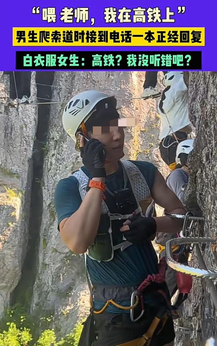 笑不活,浙江,一小伙在爬高空索道时,突然接到老师打来的电话,结果小伙接起电话后,