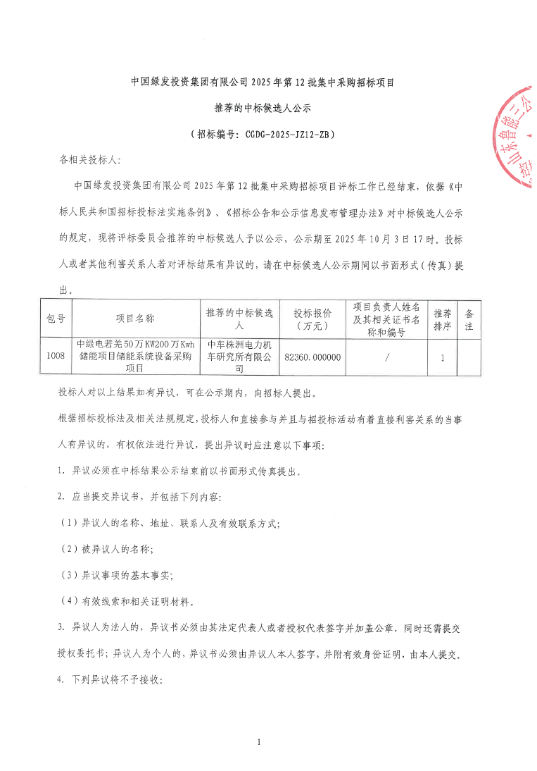 储能与电力市场获悉,9月30日,《中国绿发投资集团有限公司2025年第12批集中采购招标项目推荐的中标候选人公示》发布。