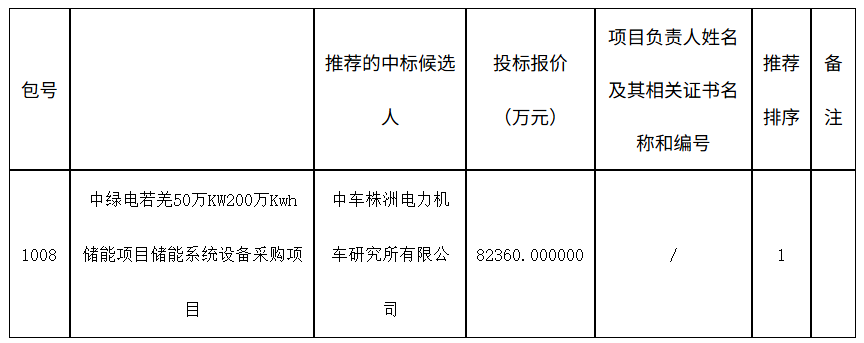 该项目装机容量500MW/2000MWh,中车株洲所以总报价82360万元,折合单价0.4118元/Wh,成为中标候选人。