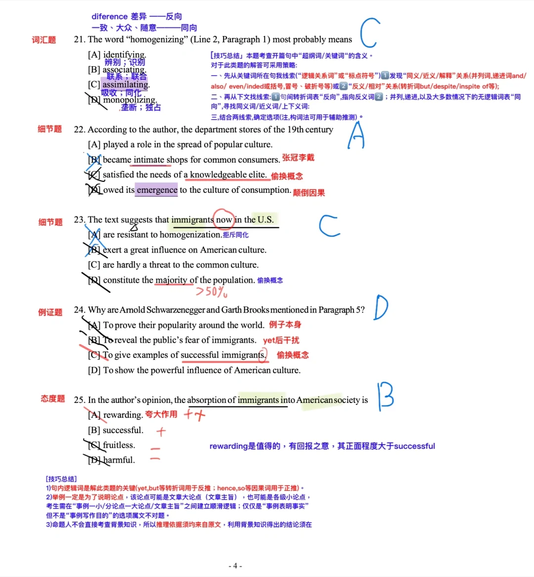 3⃣️4⃣️第三、四段从语言、住房自有、异族通婚三个角度论证指出移民正快速融入美国文化。