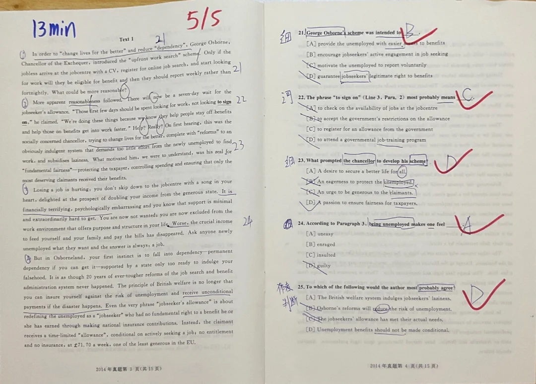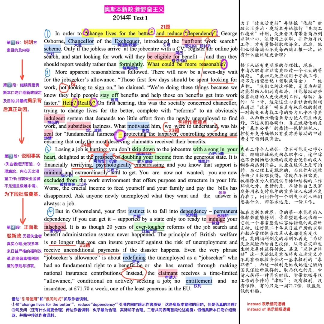 ①句“change lives for the better'”、reduce“dependency'”引用的同时暗示作者质疑:这是奥斯本宣称的目的,但是否真的合理?