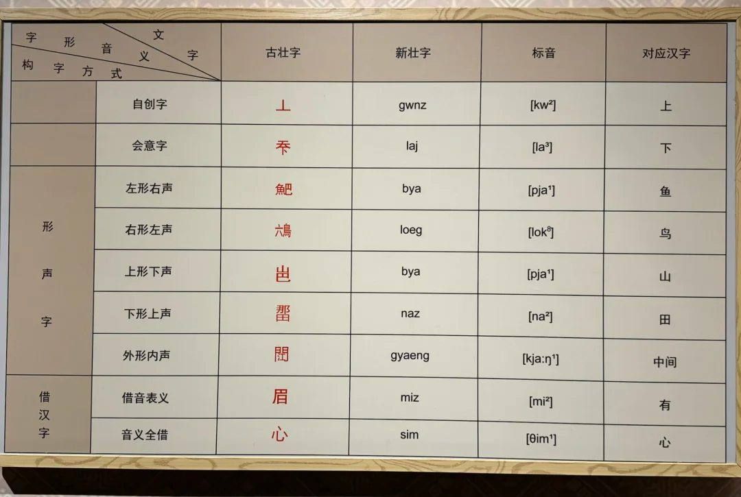 • 构形模式:主要有独体形符字、标形合成字、会形合成字等构形模式。其字形与所表达的词义互为表里,不过与古汉字、纳西东巴文等象形文字相比,古壮语象形字具有字形简单、表意抽象的特点,且书写风格有向楷书体方向发展的趋势。