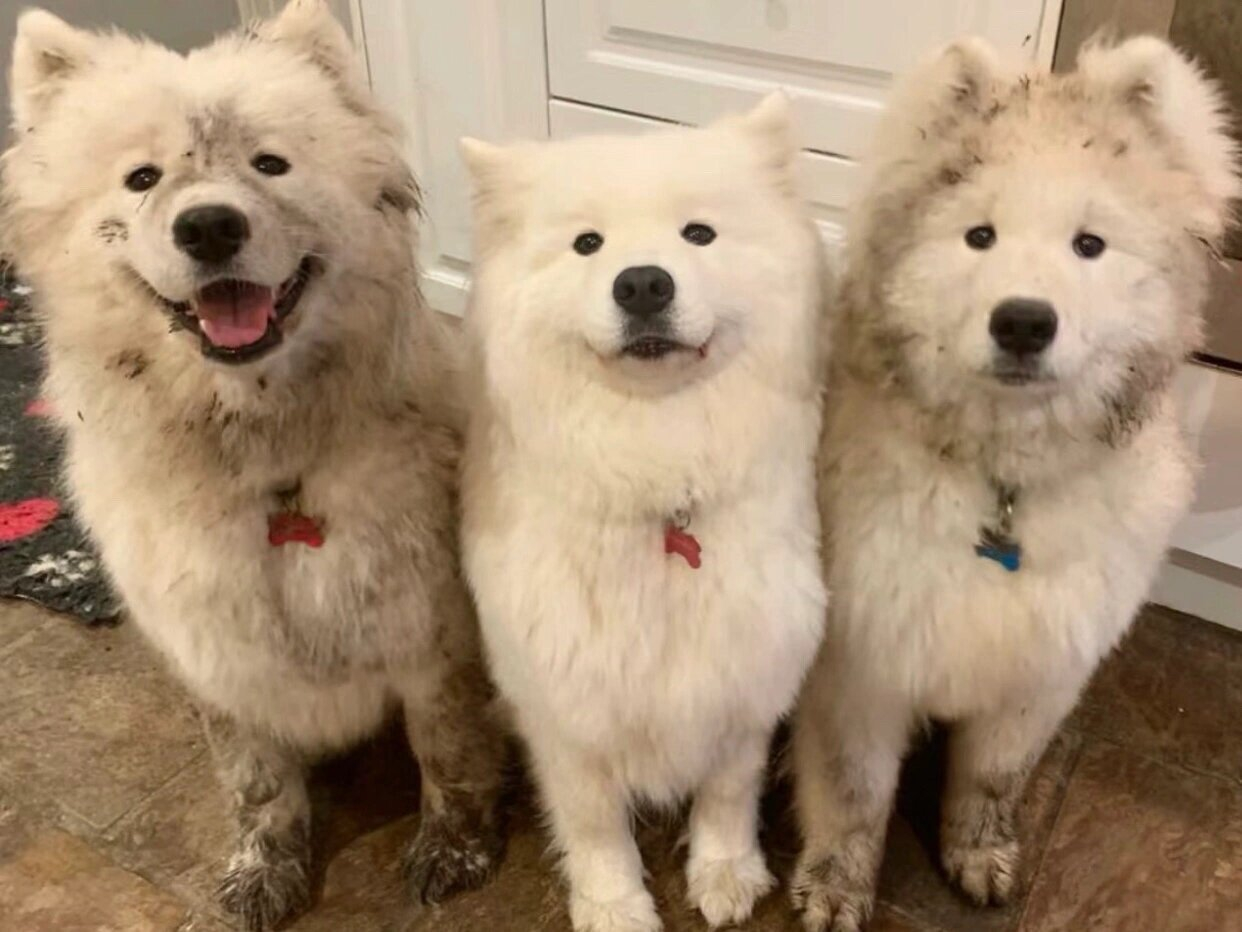 中间的萨摩耶:愣着干嘛,快点表扬我耶