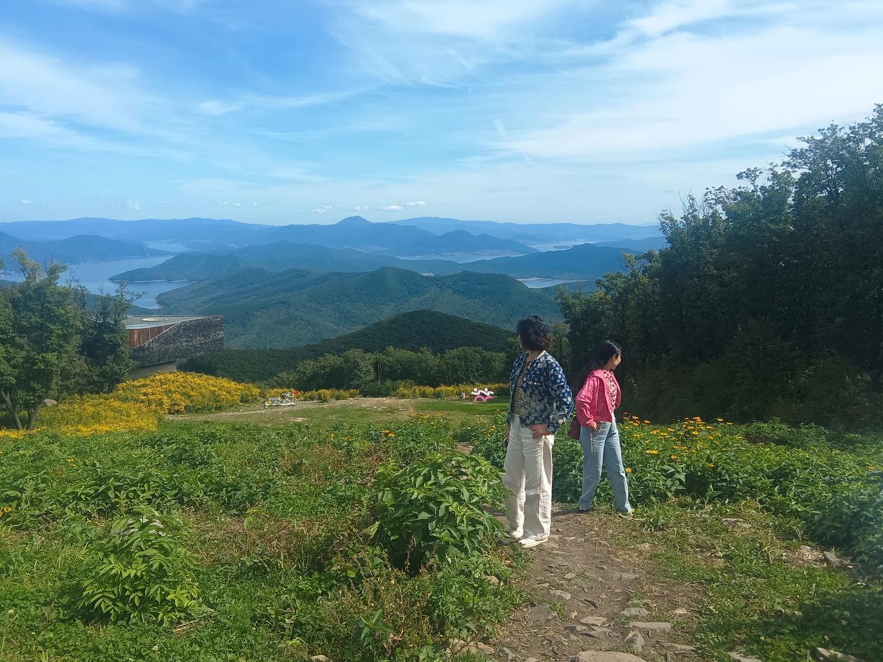 不冷不热天渐凉 丹桂飘香水一方 遥看有女山中立 闲看落日染山岗