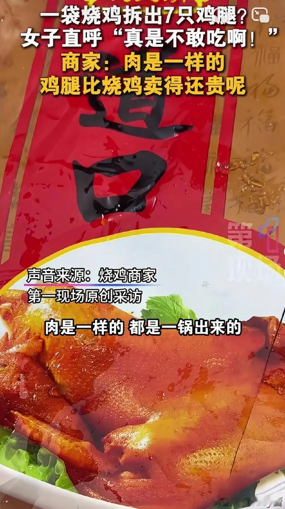 网友买了一只烧鸡 没想到一只烧鸡7个腿! 这……这……违背自然规律啊? 谁家鸡有7个腿的? 商家回应:都是一锅出的,鸡腿还比鸡贵呢?要不行我再给你发一只整的! 那么好奇心促使我不得不多问几句 既然鸡腿都跑网友买的这个袋子里了 其他少腿的被谁买去了?[捂脸]
