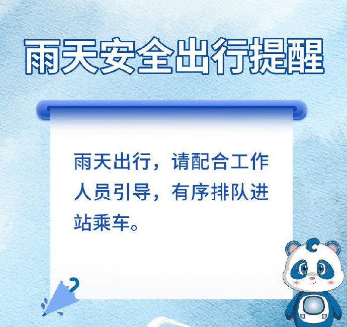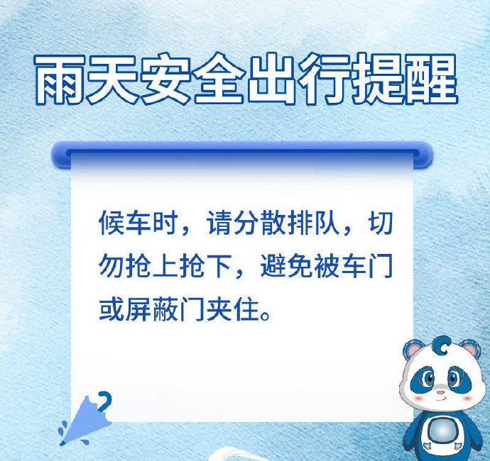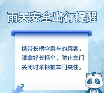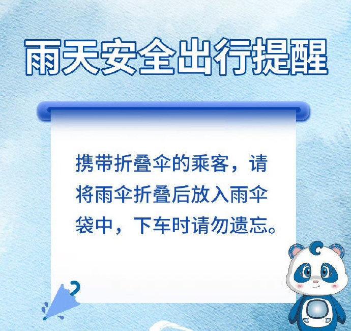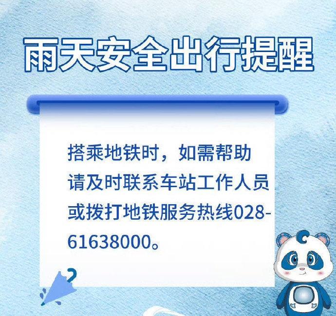 雨天出行,地面湿滑,请注意安全,带长柄伞的乘客上车后要记得收好长柄伞,防止车门关闭时长柄伞被车门夹住,在乘坐地铁过程中如需帮助,可以联系车站工作人员或拨打我们的服务热线02861638000