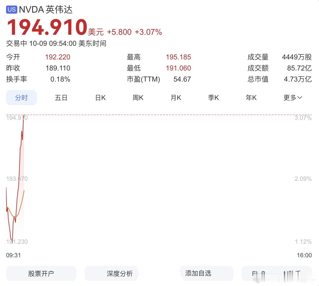 英伟达再次创新高 英伟达涨超3%,股价194.8美元,再创记录新高,总市值达4.73万亿美元!A股