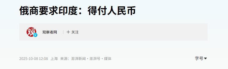 [熊猫]印度这次做出最明智的决定,就是用人民币购买俄罗斯的石油,10月7日,路透社报道,俄罗斯石油贸易商已经明确要求印度以后购买俄油必须用人民币结算。   俄乌冲突爆发后,欧洲和美国先后对俄罗斯实施了严厉的经济制裁,冻结其外汇资产、限制贸易支付渠道。   俄罗斯为规避被西方体系“卡脖子”,早已在全球推动本币结算,这不仅涉及石油贸易,也涉及天然气、煤炭和其他大宗商品。   中国作为俄罗斯主要能源出口对象,使用人民币结算早成常态,但印度以前多数依赖美元或阿联酋迪拉姆,现在被明显要求切换货币模式,是对西方制裁的现实回应。   真正值得注意的是,其中体现的不只是俄罗斯的主动,更有印度的深思熟虑。   能源市场近两年风云变幻,制裁导致俄油大量折价销售,印度一跃成为俄油最大买家,极大降低了自身的能源成本。   西方国家对此多有不满,印度却始终以国家利益为先,不为外部压力所动,现在面对新的结算要求,印度并没有激烈反对或拒绝。   原因很简单,高性价比的俄油严重依赖稳定供应和顺畅结算,只要用人民币结算不影响实际采购,只要中国金融体系足够开放和安全,只要俄罗斯愿意继续提供优惠,印度完全愿意配合,这就是典型的现实主义外交和经济利益权衡。   不少人会好奇,用人民币结算究竟带来了哪些影响?   对印度本身,首先解决了西方制裁之下美元转账障碍,俄印直接用卢比或者第三方货币,常常面临资金清算和外汇风险。   人民币在国际市场上的流动性虽不及美元,但过去两年中俄能源贸易屡屡突破制裁壁垒,为部分新兴经济体树立了范例。   中国拥有完善的金融基础设施,人民币国际支付系统多次表现出高效可靠,对于早就与中国建立贸易联系的印度企业而言,逐步适应人民币支付,其实难度没有外界想象的大。   政策层面,印度央行也早在探索多元结算渠道,一旦确认合规与安全,完全可以灵活应对。   美欧对俄罗斯能源禁令的实效性受到质疑,印度巨大的进口需求很快填补了市场空白,此举也撬动了石油行业的传统支付体系,削弱了美元结算在全球石油贸易中的垄断地位。   人民币与卢布之前的互换协议,间接影响到金融中心地位的再平衡,随着更多类似案例出现,世界能源市场的定价和结算逻辑,正在逐步向“多货币、多选择”的新阶段过渡。   此前沙特已经不止一次释放信号,未来可能引入人民币、欧元、卢布等多种货币,印度这次行动,无疑起到了表率作用。   更进一步地看,人民币在石油贸易中的角色提升,是中国国际化战略与金融体系日益成熟的一个侧面。   中国不仅是全球第二大经济体,还是能源消耗大国,对稳定能源供应和国际结算极为敏感。   长期以来,美元霸权造成的汇率风险与支付壁垒,让许多新兴市场国家倍感掣肘。   在能源关乎国本、博弈日趋激烈的当下,能够选择交易货币,意味着提升了话语权与安全边界。   俄罗斯希望通过人民币规避欧美的金融拦截,印度则借力减轻美元结算风险。   可以预见,未来石油“去美元化”将是全球趋势,而这仅仅是序幕。   面对地缘动荡、能源重塑、美元收缩的多重考验,印度没有执迷于单一支付渠道,而是用实际行动为自己争取最大回旋空间。   这种策略并不容易,很考验政策的平衡技巧,但倘若顺势而为,把眼光放长远,或许印度此举将成为新兴大国壮大自身的话语权与利益格局的一个关键节点。   你觉得印度此举会加速地区乃至全球的“去美元化”进程吗? 信息来源:观察者网《俄商要求印度:得付人民币》