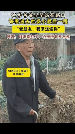 “看着都心疼!”江苏宿迁,一位老爷爷在得知朋友出殡日期后,不到6点就起来守在路口,就为了送朋友最后一程吧。网友:年纪大的尽头就是孤独吧! 据老爷爷的孙子说:去世的老人是他爷爷的发小,在他知道早上6点出殡后,他在6点之前就站在那里等了,看着发小出殡慢慢走远,看的眼眶都湿润了。 这是老爷爷目送发小的最后一程,以后再也看不到曾经陪他的发小了。面对同龄人一个个的离去,老人心里也是五味杂陈,非常的伤感。 有人网友说:老人家看到了自己未来的样子,年龄大了最怕听到自己同龄人去世的消息。 以前的发小,一般都是一个村从小玩到大的,感情特别深厚。现在住在高楼大厦,有时候连邻居家住的人都没见过。现在有些发小在成家立业后,为了生活也是各奔东西,感情渐渐疏远。