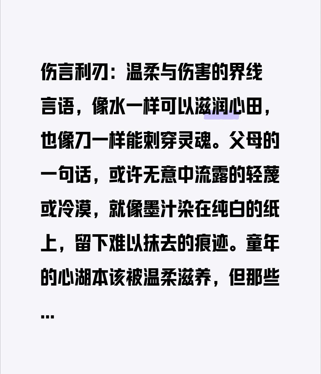 伤言利刃:温柔与伤害的界线 言语,像水一样可以滋润心田,也像刀一样能刺穿灵魂。父母的一句话,或许无意中流露的轻蔑或冷漠,就像墨汁染在纯白的纸上,留下难以抹去的痕迹。童年的心湖本该被温柔滋养,但那些无声的寒冷逐渐让纯净变得冰封,孩子对世界的信任也被无形中割裂。 那些稚嫩的羽翼,努力扑打着,追求的不是广阔的天空,而是一个温暖的小巢。可现实中,父母那冰冷的目光,比严冬的寒风还要刺骨。时间流逝,你是否注意到许多成年人的眼中,始终笼罩着一层漠然的雾气?许多父母把问题归咎于外界的污染,却不曾意识到,孩子心中那些被挖苦和贬低的伤痕,早已深深刻在灵魂深处。这些伤痕不像沙滩上的脚印,风一吹就能抹去,而是像碑文一样镌刻在心底,痛入骨髓,难以愈合。 孔子在《孝经》中指出,孝的核心在“养”与“敬”。父母只满足于物质的供给,却忽视了对孩子心灵的尊重和关爱。孔子说:“爱亲者,不敢恶于人。”然而,许多父母的轻慢与冷漠,像逆流的洪水,无情地冲刷着孩子对自我和他人的爱。当那些冰冷的话语像利刃一样刺穿孩子的心,长大后,他们心中的悲愤会变成一种呐喊:“连我最亲的人都不爱我,天地间还能剩下什么值得我去爱?” 这种矛盾,源自哪里?也许是“恨铁不成钢”的固执,或者误以为刻薄可以激发孩子的潜能。可当心灵的桥梁断裂,唯一的出路就是转身离开。远离那充满冷漠的阴影,心才能在抽离中找到喘息的空间,重新拼凑破碎的自己。 让我们看看人间的无声悲剧:孩子考出好成绩,父亲却冷笑一句:“瞎猫撞死老鼠。”孩子拼命努力,仍难逃母亲的不满与讥讽;在职场遭遇挫折,冷漠的一句话“人心不足蛇吞象”又将心压入深渊。养育下一代的艰辛,最终却被一句“你没用”所轻视。这是一股深不见底的漩涡,把幼小的生命困在寒潭中。即使枝叶试图伸向天空,也难以触及应有的光明。 到了三十、四十岁,许多人的心还在昔日父母的冷言冷语中挣扎。外表坚强,内心却藏着难以愈合的旧伤。孟子说过:“人生三大乐事:父母在、兄弟无故。”父母在本应带来温暖,但很多时候,却让人感受到的是失望与寒冷。人生漫长的旅途,未曾真正照亮自己心中的光。 语言,本应是渡人的舟楫,却变成了伤人的利刃。古人讲究含蓄与克制,善意的话语像醇酒,令人回味无穷;而误用的“激将法”却像穿肠的毒药。我们信奉“道德经”中的“大道无声”,强调用沉静的智慧照亮迷途,但现实中,许多父母用刻薄的话语,把善意变成了伤害。 试想:孩子一时找不到铅笔,父母怒斥:“你那眼睛算白长的吗?”为什么不温和地说:“铅笔放在那儿,习惯就好。”前者如滚烫的油,灼伤孩子的心;后者像春风,轻轻拂面,指引孩子前行。反之,如果父母说:“你真笨,猪脑子!”那就像用鞭子抽打着孩子的心脏。这些恶语,不仅伤害了孩子的自尊,更在他们心中埋下一把冷刀。 《管子·形势解》曾说:“言辞信,动作庄,衣冠正,则臣下肃。”意思是,家长的言行要可信、庄重,才能赢得孩子的尊重。真正的家庭,不在豪华的房屋,而在那双温暖而忠诚的眼睛。用心去守护孩子的成长,就像呵护嫩芽,只有在温暖的目光中,孩子才能冲破风雪,绽放光彩。 让我们记住:刻薄的话语像寒冬的寒风,冻僵了孩子的心;而温暖的言辞像春风,能融化心底的冰雪。每一句善意的话,都是一把钥匙,开启孩子心中那扇通向希望的门。当我们用温柔的话语抚慰心灵,用真诚的关怀点亮未来,孩子的心灵就会像星辰一样明亮,照耀他们自己,也温暖整个世界。 总结一句:伤人的话语像利刃,能刺穿心灵;而温暖的话语则能疗愈伤痕。家庭,是孩子最初的港湾。只有用爱与理解,才能让那片港湾成为温暖的灯塔,引领他们走向光明。让我们用善意和温柔,去呵护每一颗纯真的心,让每个孩子都能在爱的光辉中,茁壮成长,迎接属于他们的美好未来。最伤人的话语 伤人最深的语言 真心与伤害 言语伤害