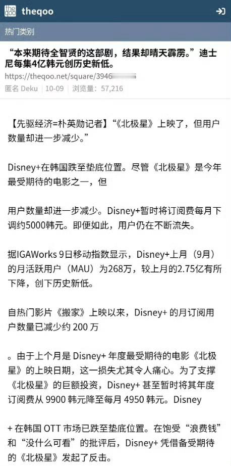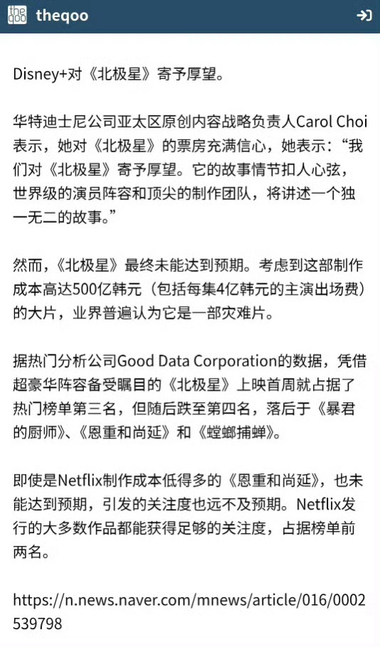 迪士尼对全智贤主演的《暴风圈》期待值非常高,主演每集片酬4亿,总制作费500亿的大制作,但这部剧创迪士尼最低收视率,业界评价这部剧「简直是爆扑水准」[摊手]