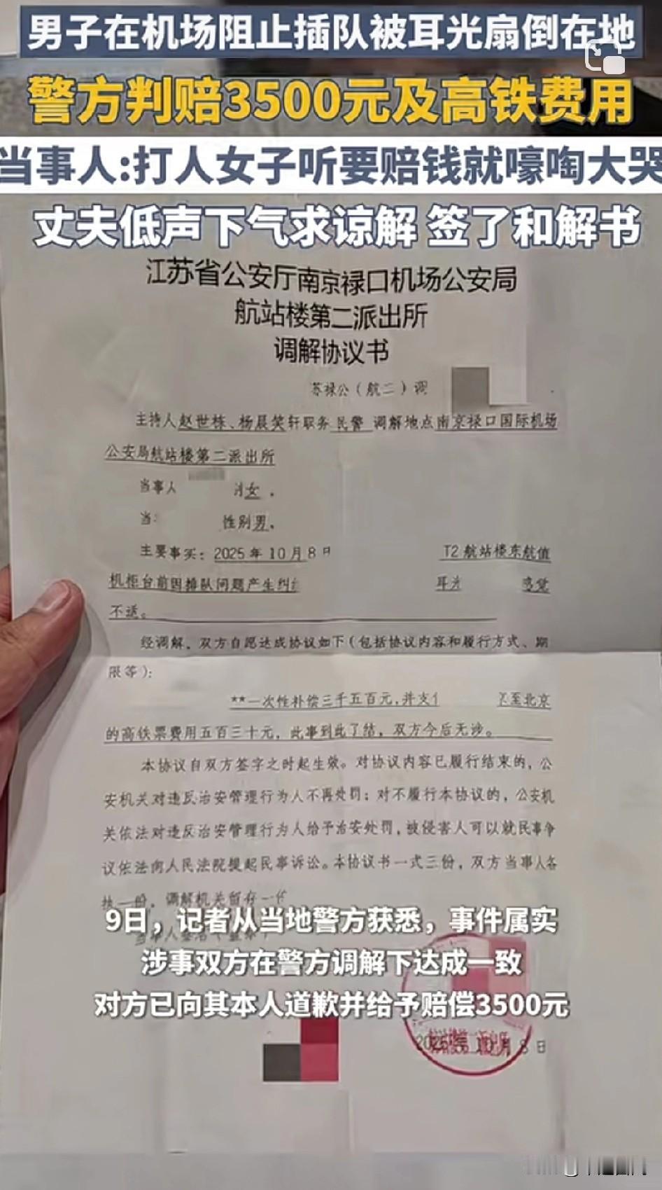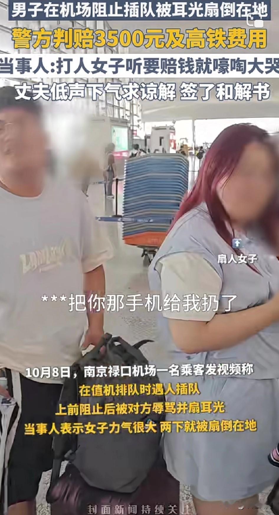 一个耳光换3500元到底值不值? 男子在机场阻止插队被女子耳光扇倒在地,警方判赔3500元及高铁费用! 这家人就不应该谅解,因为下次不知道是哪个人遭殃!得叫这家人长记性,人不是那么好欺负的! 不过尽量控制点,我前段时间也是和一女的打架被讹了3000,还是她先动手,结果被我KO啦[笑哭]!