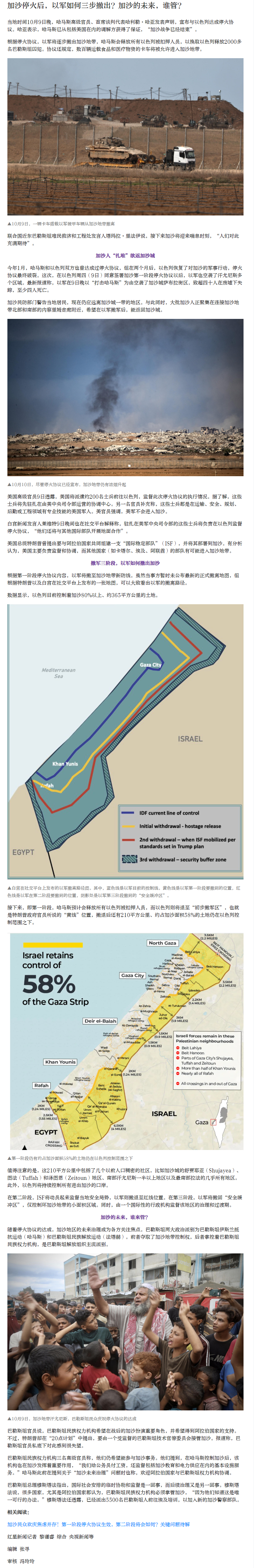 【#加沙停火后以军如何三步撤出#】#加沙的未来谁来管# 当地时间10月9日晚,哈马斯高级官员、首席谈判代表哈利勒·哈亚发表声明,宣布与以色列达成停火协议。哈亚表示,哈马斯已从包括美国在内的调解方获得了保证,“加沙战争已经结束”。根据停火协议,以军将逐步撤出加沙地带,哈马斯会释放所有以色列被扣押人员,以换取以色列释放2000多名巴勒斯坦囚犯。协议还规定,数百辆运载食品和医疗物资的卡车将被允许进入加沙地带。