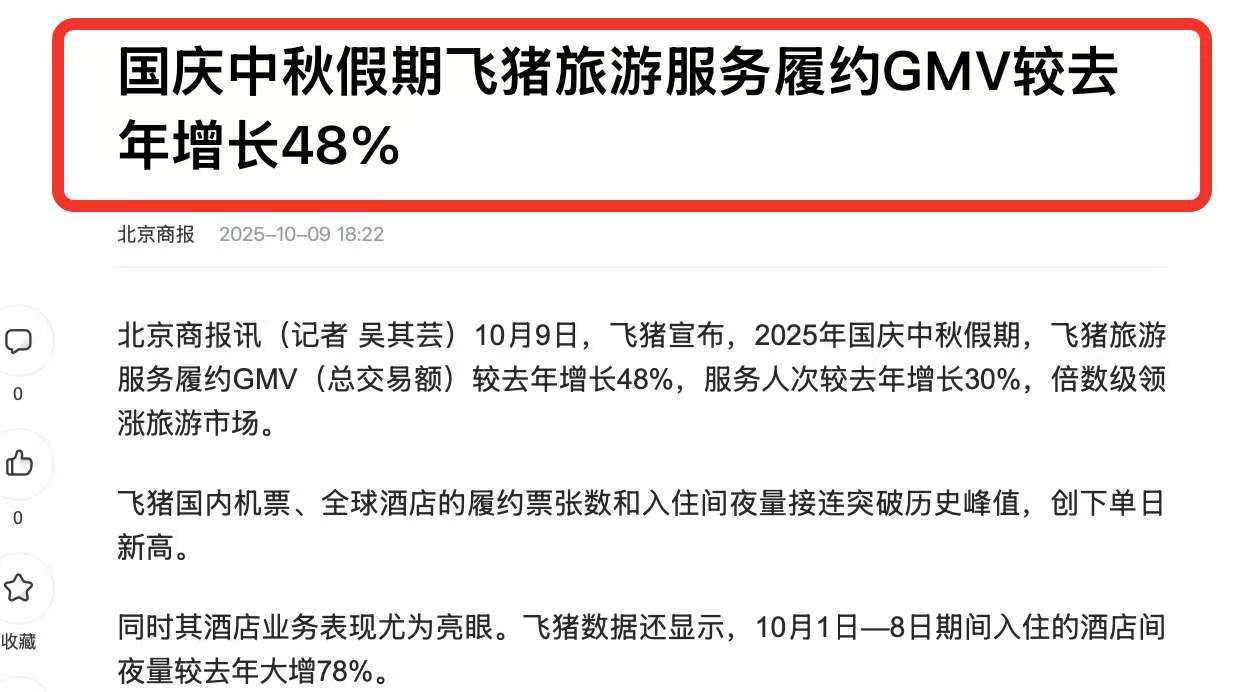 中国社会出现一个明显变化,很多人都没想到,但飞猪已经有了反应。 这个明显的变化,那就是当下的中国人,更愿意出去旅行,去带着家人一起感受不同的文化,不同地方的美食和风景。 这个变化,文化和旅游部数据中心测算数据体现的很明显,根据测算,国庆中秋假日8天,全国国内出游8.88亿人次,较2024年国庆节假日7天增加1.23亿人次。 对于文旅行业来说,这个数据可谓是“泼天的流量”了,但从目前各家的数据来看,这波流量接的最好的还要数飞猪。 飞猪2025年国庆中秋假期业绩很亮眼,履约GMV较去年增长48%,服务人次较去年增长30%,此外,在用户规模增速和交易规模增速方面,分别达到了整体市场的2倍和3倍。 飞猪能交出这么亮眼的成绩单来,除了其服务质量非常高之外,更重要的是战略选择更正确,抓住了当下的消费需求。 现在网上消费,大伙喜欢的是一站式搞定。而飞猪自从加入阿里中国电商事业群之后,不仅在淘宝APP首页有了入口,同时,淘宝大会员可直通飞猪会员、获得飞猪会员等级对应的旅行权益。 说的直白点,就是你在淘宝上买东西,做旅行准备的时候,能通过淘宝直接进入飞猪,借助88VIP的会员权益,能以最具性价比,无需比价,简单直接全部搞定机票、酒店、景点门票等复杂的事儿。 要知道,88VIP会员规模现已突破5300万,根据数据显示,会员的消费能力是普通用户的8-10倍。在这种影响下,10月1日至10月8日期间,88VIP用户为酒店带来的间夜量增长了120%,换句话说就是飞猪为众多的酒店商家带来了新的增长机会。 通过这些,也证明了一件事,那就是阿里大消费平台的战略是无比正确的,为线下的商家带来新的增长,也相信随着时间的推移,这个战略会带来更多积极的影响,为中国的服务行业带来更多新的变化。