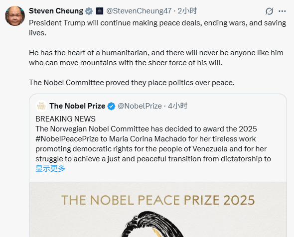 阿川还没回应,白宫新闻主任张振熙 (Steven Cheung)已经先冲上去了!说炸药奖委员会有眼不识泰山,是把政治放在和平之上。这个Steven张,据传就是替阿川发帖的人,但不知道这回会不会拍在马蹄子上。
