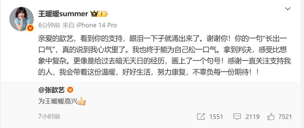 【#王暖暖感谢张歆艺#】10月10日,南京市秦淮区人民法院对备受关注的“孕妇泰国坠崖”离婚案作出一审判决,准予离婚,并判令被告俞某某支付原告离婚损害赔偿50万元。发文感谢:亲爱的歆艺,看到你的支持,眼泪一下子就涌出来了。谢谢你!你的一句“长出一口气”,真的说到我心坎里了。我也终于能为自己松一口气。拿到判决,感受比想象中复杂。更像是给过去暗无天日的经历,画上了一个句号!感谢一直关注支持我的人,我会带着这份温暖,好好生活,努力康复,不辜负每一份期待!!