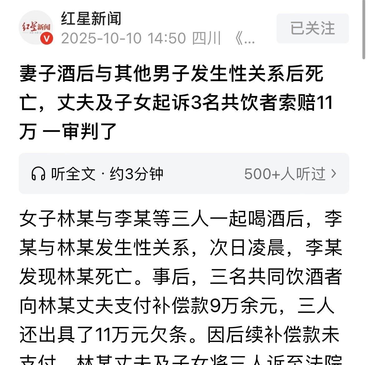 青海西宁,女子和3个朋友聚餐喝完酒后,带着其中俩朋友回了出租屋继续喝,其中一男性朋友酒后和她发生了关系,哪成想,夜里女子竟脑出血死亡了,男子凌晨发现后,连忙通知女子丈夫,事后,连带男子的3名同饮酒者向女子丈夫支付了9万的赔偿款,并开了11万的欠条,因为欠款迟迟没支付,女子丈夫就把3人告上法院,索赔那11万的欠款和利息,然而,法院判决却出乎了女子丈夫的意料。 李某和林某早年在工厂打工时相识,后来林某又通过别人介绍认识了祁某和张某。 2023年12月22号那天,为了撮合祁某和张某,4个人约在一家小饭馆吃饭。 饭桌上气氛不错,几个人喝了两斤多白酒,等吃完饭已经挺晚了,张某自己打车回了家。 剩下的祁某、李某和林某仨人则勾肩搭背一起去了林某的出租屋。 到了屋里,李某和祁某又开了白酒接着喝,林某没再喝。 晚上11点左右,祁某先走了,只剩李某和林某在屋里,接着,李某和醉酒的林某发生了关系。 之后李某起来喝了点水,就在客厅沙发上睡着了。 第二天早上6点多,李某醒来发现林某躺在身边没动静,他一摸才发现,林某身体都凉了。 他赶紧哆嗦着手用林某的手机联系了林某的丈夫赵某,赵某赶来后报了警。 法医那边出具的报告显示,林某本就患有脑血管病,那晚喝了不少白酒,再加上后面的性行为,这才诱发了致命脑出血。 配合做完笔录后,警方就让李某他们和林某家人商量赔偿的事。 面对赵某,几人也没推脱责任。李某当场签了5万欠条,又掏了5万块。祁某打了3万欠条先还2万,连早早回家的张某都含着泪塞给赵某2.05万元,承诺再补3万。 几人就这样又开了11万的欠条,可后来赵某一直没收到这笔钱,于是他和子女一起,把李某、祁某和张某告上法庭,索赔11万元和利息。 那么,从法律角度,怎么看待这场官司? 《民法典》第1165条规定:行为人因过错侵害他人民事权益造成损害的,应当承担侵权责任。 李某和林某饮酒后,李某与其发生关系,但李某随后没有履行基本注意义务,比如观察林某身体状况、及时救助,导致林某因脑出血没被及时发现而死亡。 虽然李某没有实施劝酒行为,但他作为同住者对醉酒且患有脑血管疾病的林某负有更高的注意义务。 所以法院认定李某的“疏忽”构成过错,需对林某的死亡承担相应责任。 《民法典》第1173条规定:被侵权人对同一损害的发生或者扩大有过错的,可以减轻侵权人的责任。 这个案子适用过失相抵原则体现为“双方分责”。 林某作为完全民事行为能力人,明知自己患有脑血管疾病仍参与高强度饮酒并发生性行为,直接诱发脑出血死亡,其自身过错是损害发生的主要原因。 所以法院审理后,根据这条减轻了李某的责任,最后判李某再赔2万块就行,之前给的5万块就算补偿了。 再说说同桌剩下几人,张某吃饭时没劝酒,吃完就回家了,对林某的死没责任。所以张某给的那些钱纯粹是出于人道主义。 祁某也没劝酒,还和李某一起把林某送回了家,虽然他又喝了点酒,但没劝林某喝,后来也给了补偿,尽了心,所以也没责任。 林某自己也有责任,她明知有病还喝那么多酒,还和李某发生关系,所以自己要负主要责任。 最后法院强调,每个人都是自己健康的第一责任人,喝酒要适量,特别是身体不好的更要当心。同桌的人也得互相照顾,聚会时多留意身边人。 有人说,我了觉得这个判决有失公正,李某在案件中负有过错,两人酒后发生关系,到底是自愿还是李某强迫,现在都无法证明了,不能听李某一面之词,并且他的确在女方醉酒后没有尽到照顾责任,最后只判再赔2万,太少了。 另外,法院的审判方向有错误,本案的重心是审判欠债行为,而不是责任认定。原告起诉的是欠债,他们在警察调解下已经自愿达成协议,并且有欠条存在,本案应该只负责清理欠债就可以了。 还有人提醒了,组局喝酒有风险,喝酒人必做的三件事!第一,喝酒前,组织者要关心喝酒对象是否有不适合喝酒的疾病或属于不适合喝酒的体质;第二,喝酒过程,组织者不要对参与者劝酒和逼酒,其他参与者有劝酒或逼酒行为,要予以制止;第三,喝酒后,组织者要把确保(自己送或委托他人送)每个参与饮酒者安全到家,对于明显喝多、身体出现异样的参与者,要及时送医院救治! 对于这个判决结果,你怎么看? 欢迎关注@一案一论 #头号创作者激励计划#