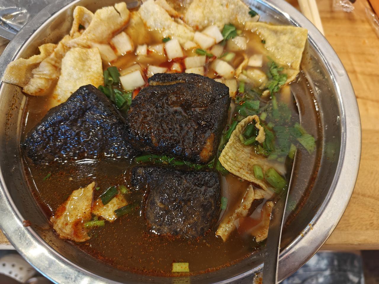 现在吃螺蛳粉越来越舒适了,请店家帮忙粉煮的时间长一点,加上臭豆腐,酸笋,炸蛋,炸猪皮,再来一个冰凉的豆花,美味
