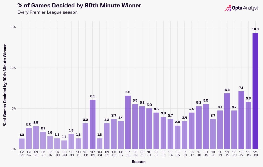 但是,虽然现在比赛时间更长了,但仅这一事实并不能解释本赛季发生的情况。2025-26赛季在第90分钟或更晚时候的进球比英超历史上任何其他赛季都要多,但还有更多情况:由第90分钟的致胜球决定比赛胜负的比例比以往任何时候都要高。