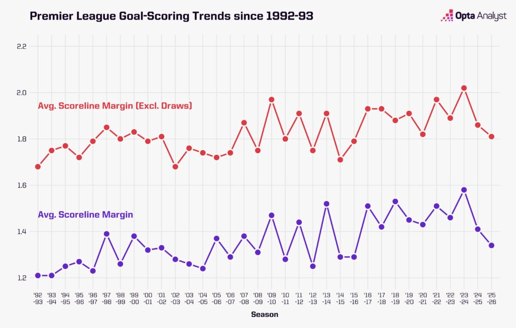 然而,现在它是十年来的最低值,2025-26赛季球队之间的平均比分差距为1.34。至少目前来看,本赛季积分榜底部没有鱼腩球队,大比分胜利也比以前更少见了。上一次平均比分差距这么低是在2015-16赛季,当时没有一支球队能够一骑绝尘,英超最好的球队实力非常接近,以至于赛前夺冠赔率为1赔5000的莱斯特城最终爆冷夺冠。