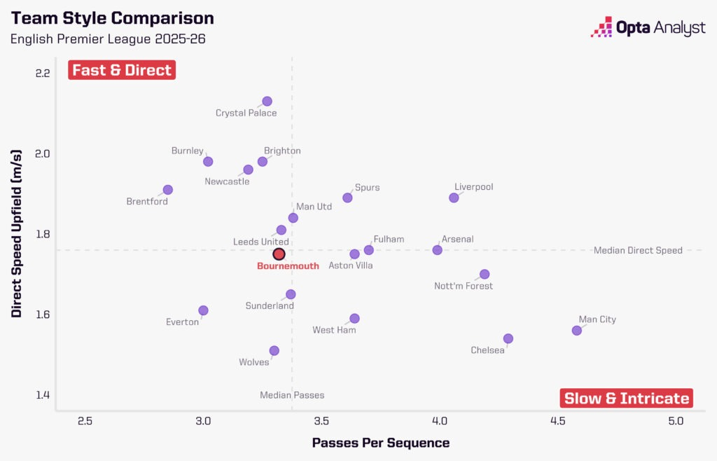 本赛季,伯恩茅斯通过“直接进攻”(本质为反击,定义为:在己方半场内发起的运动战进攻,至少50%的推进方向朝向对方球门,且最终以射门或在对方禁区触球收尾)打入4球,这一数据位居英超所有球队之首;仅利物浦(15次)通过此类进攻完成的射门次数比他们更多。