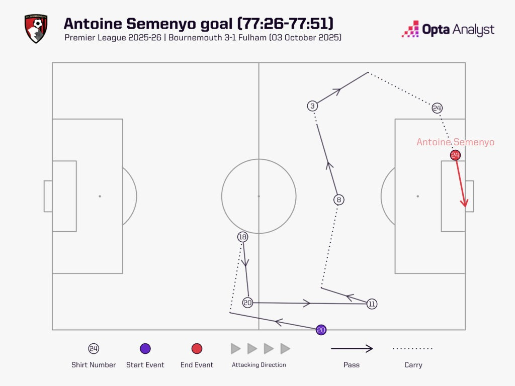 颇具戏剧性的是,塞梅尼奥最近一次高光表现,对手仍是富勒姆。他的首粒进球堪称“塞梅尼奥式经典”:左路连续突破两名防守球员,随后在小角度下将球从贝恩德·莱诺双腿间打入;第二粒进球(将比分定格为3-1)则终结了一次典型的伯恩茅斯反击——球队发起攻势时,塞梅尼奥从己方禁区深处启动,经过一次全力冲刺后,轻松完成射门(至少对他这样水平的球员而言,这记射门难度不大)。