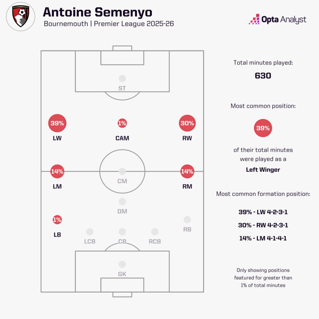 塞梅尼奥的身体天赋让他成为“转换进攻”中的理想接球点:他速度极快、进攻直接、身体对抗能力出众。他是伯恩茅斯队内速度最快的球员,本赛季最高时速达到34.2公里/小时;英超联赛中,仅5名球员的冲刺次数(152次)比他更多。
