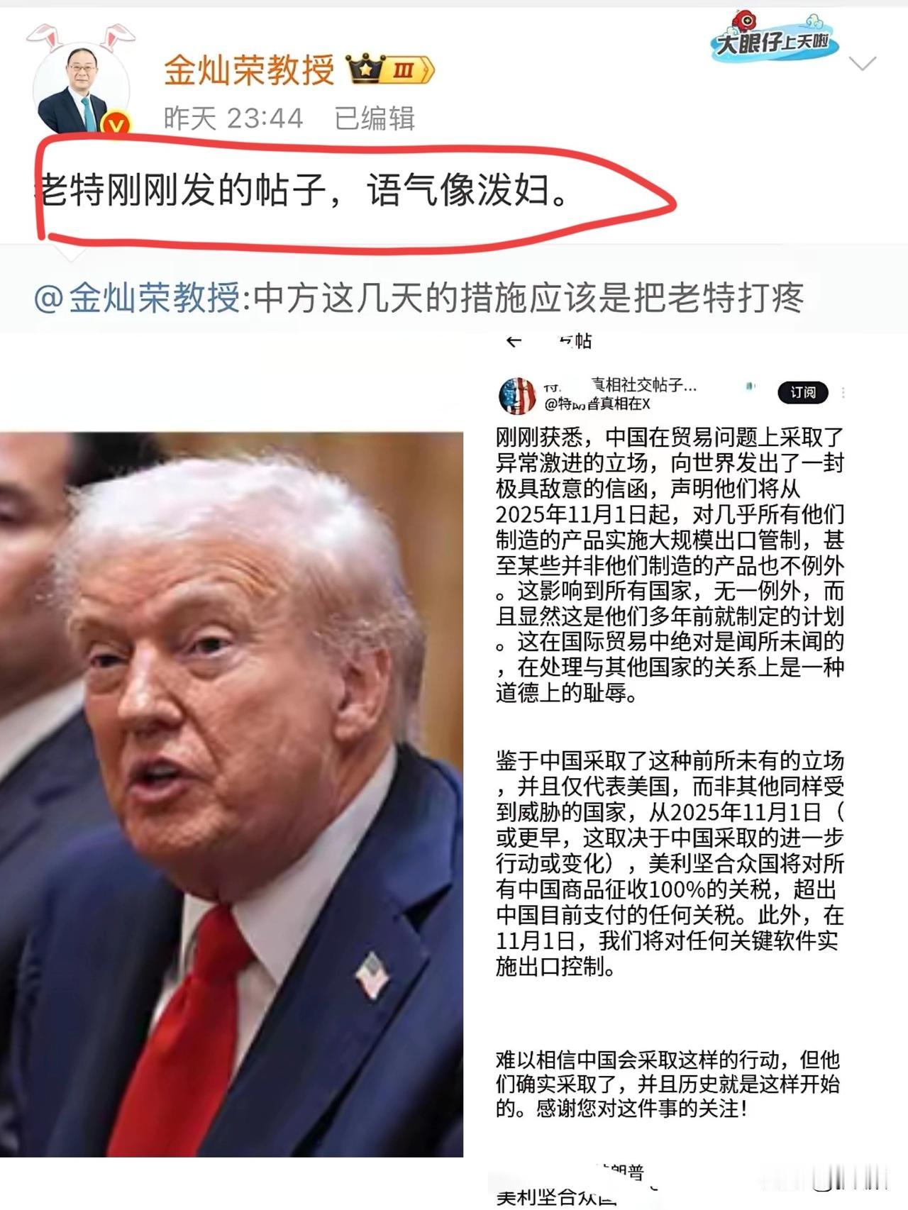 金灿荣直呼“老特像泼妇”,这波交锋太有看点! 金灿荣教授这次可真是“火力全开”,直言老特新发的帖子语气像泼妇!从昨晚到今上午,教授一刻不松懈地盯着老特动态,结果老特那洒几百字,总结起来就是在100%关税基础上,给关键软件又加了码。 这操作,咋看都像是黔驴技穷,只能靠这招刷存在感。咱这边早有应对,稀土一管严,查他们企业,见招拆招。这次反应如此迅速,估计老特心里那叫一个憋屈,直接就“泼妇骂街”了。 在这场没有硝烟的“战场”上,老特的小把戏似乎早被咱看穿。咱以不变应万变,稳稳接招。大家觉得老特接下来还会使出什么新花样?咱又该如何见招拆招呢?