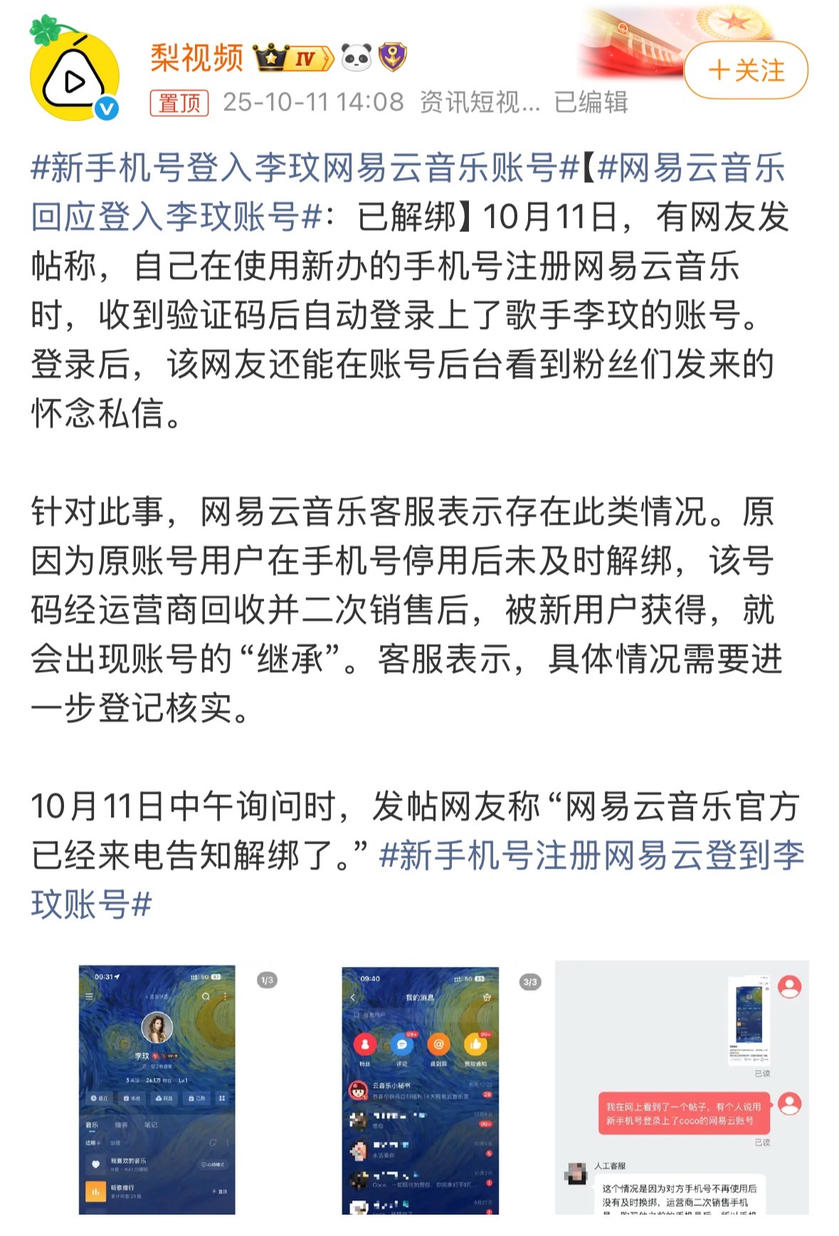 一个冷知识,联通手机号欠费3个月就直接给你回收卖给别人了,你的手机号关联的银行啊app注册信息balabala的,但凡需要验证码,都基本搞不回来了,别问我是怎么知道的……P.s 好想CoCo….[泪]网易云音乐回应登入李玟账号