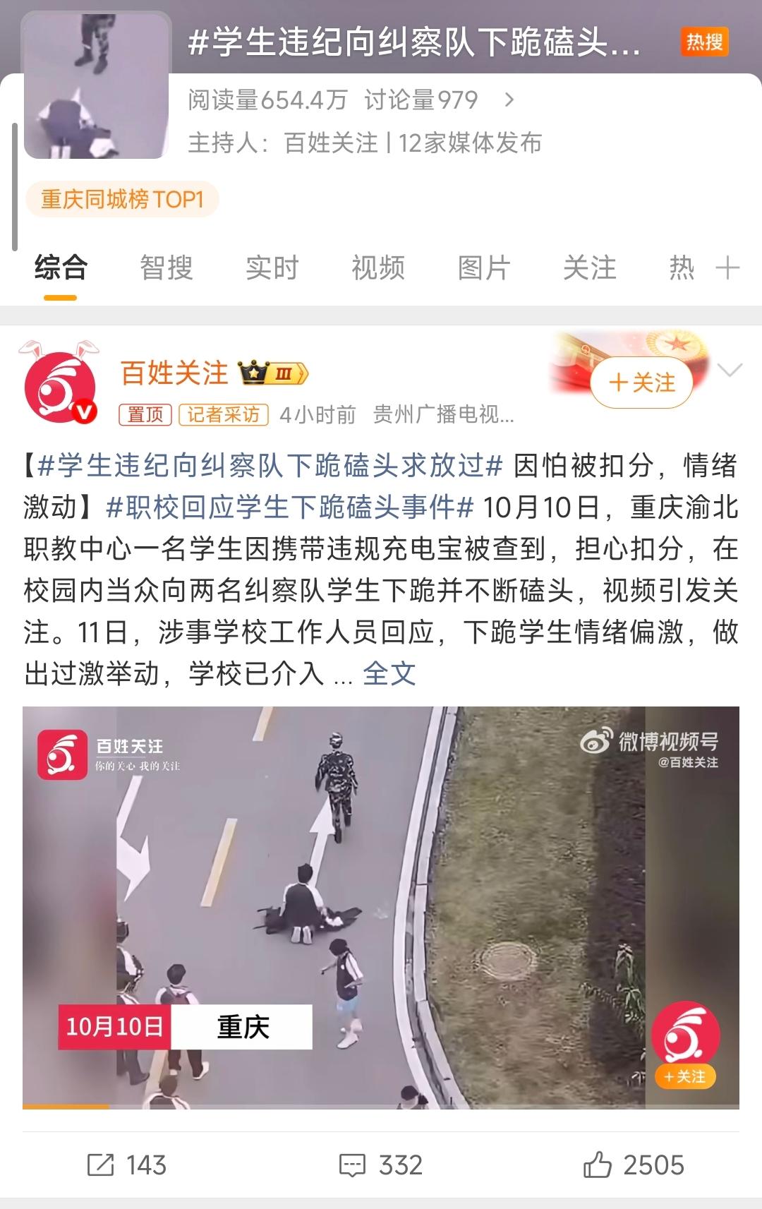 一个充电宝不是什么大事,怎么就直接下跪磕头了呢? 这位学生因携带违规充电宝被学校纠察队查到,怕被扣分,于是就在大庭广众之下向纠察队学生下跪并一直磕头。 这到底是学校纠察队平时在校权利太大,还是这位学生心理承受不住的偏激行为?为了一个充电宝就下跪磕头属实有点离谱了,学校的制度也特别擅长于把学生驯化,很容易让心理承受能力一般的人做出偏激行为,而对于学生而言,若小的事都会在心里放大。