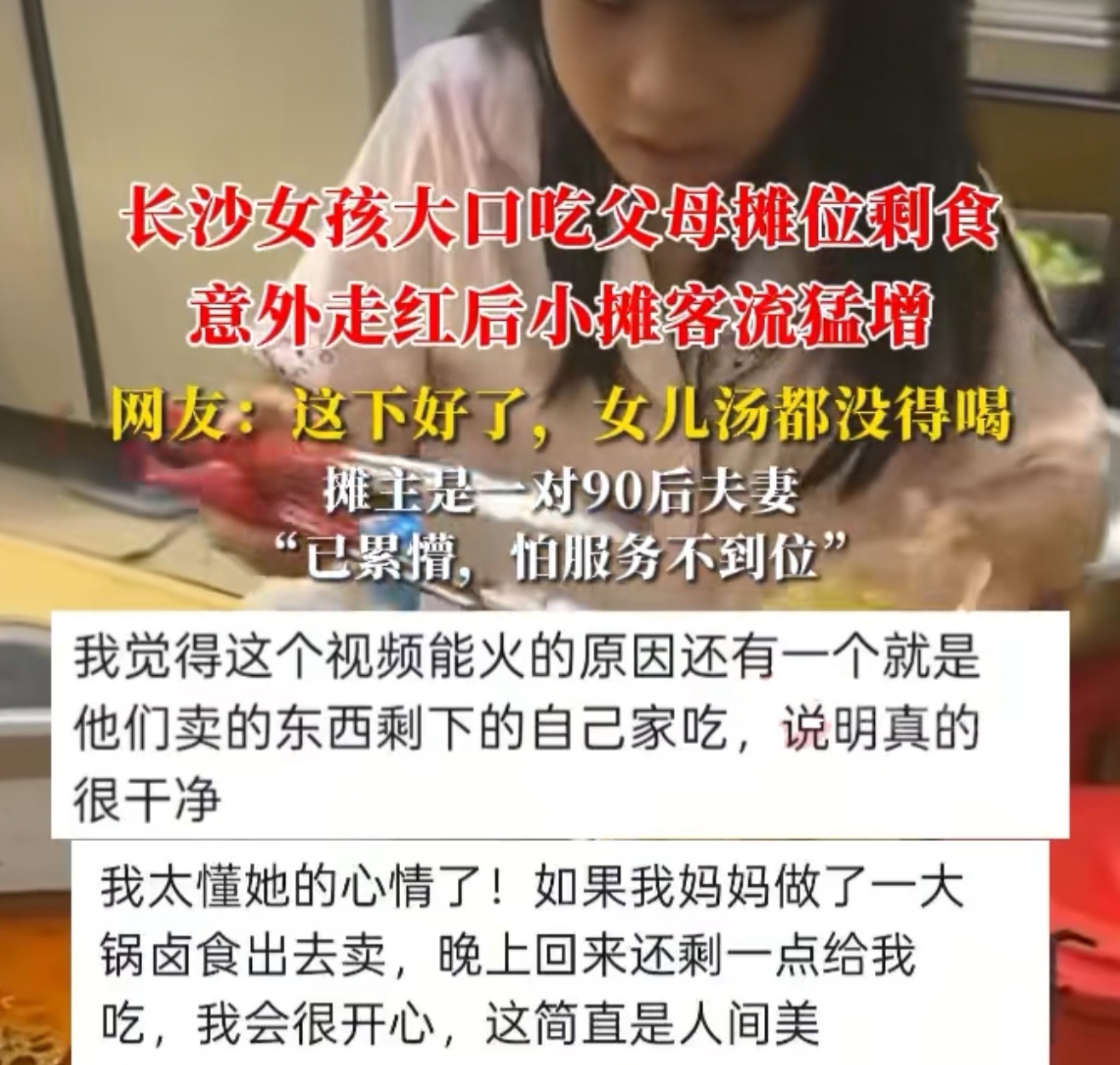 摊主女儿大口吃父母摊位剩食走红 自己的女儿都吃,说明食品安全,可以放心吃,而且也不会隔夜留着第二天卖给大家。看着有点感动,这可能就是底层老百姓的写实,才会被大家讨论和喜爱吧。
