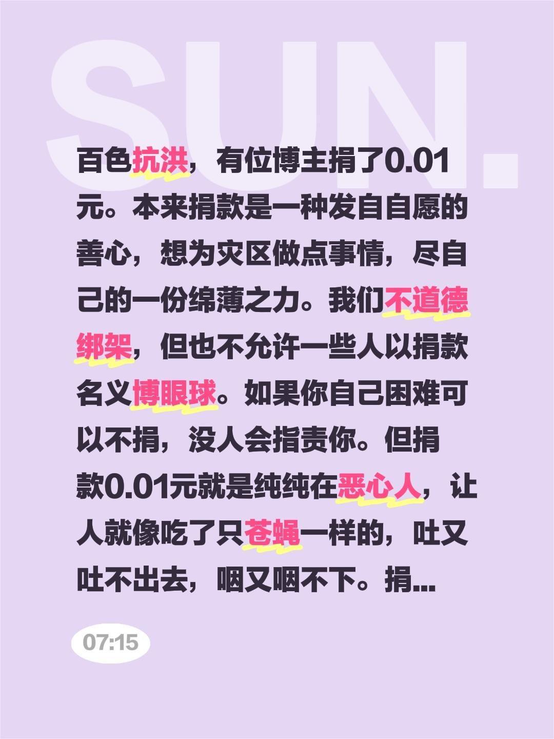 我评论了@齐鲁晚报·果然视频 的作品: 百色抗洪,有位博主捐了0.01元。本来捐款是一种发自自愿的善心,想为灾区做点事情,尽自己的一份绵薄之力。我们不道德绑架,但也不允许一些人以捐款名义博眼球。如果你自己困难可以不捐,没人会指责你。但捐款0.01元就是纯纯在恶心人,让人就像吃了只苍蝇一样的,吐又吐不出去,咽又咽不下。捐1分钱和一块钱,我们还是能分得清楚的,1块是爱,1分那是侮辱人。有一些网友留言,什么先生大意,以身入局的,我觉得这些人还是少看点小说,不要把脑子坏了百色 百色捐款 杨守田
