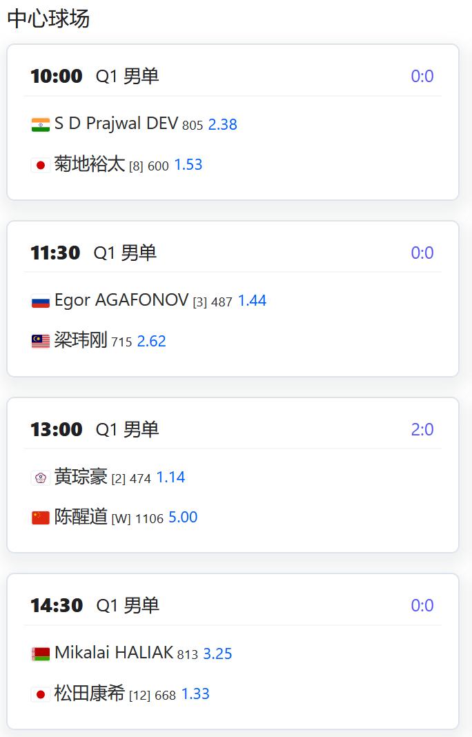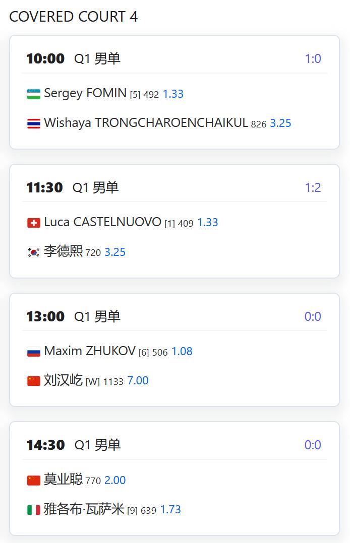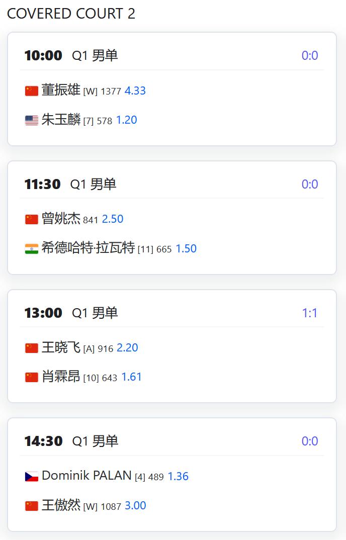 今日赛程: WTA500赛宁波站,女单资格赛决胜轮,郭涵煜将与拉希莫娃争夺一个正赛席位; 杨一迪将与8号种子森梅兹争夺一个正赛席位; W125济南,女单资格赛第一轮,逯佳境将对阵奥夫查伦科; 姚欣辛对阵持外卡参赛的小将张瑞恩; 郑妩双对阵田方然; 朱宸汀对阵6号种子雷因戈德; W100 Les Franqueses Del VallÈs,女单资格赛第一轮,刘敏对阵8号种子法国球员; 持外卡参赛的张子叶对阵11号种子拉波特科娃; 田嘉琳对阵13号种子瑞兹; CH75深圳,男单资格赛第一轮,持外卡参赛的陈醒道对阵2号种子黄宗豪; 董振雄对阵7号种子美国人朱玉麟; 曾姚杰对阵11号种子拉瓦特; 替补入围的王晓飞对阵肖霖昂; 王傲然对阵4号种子帕兰; 刘汉屹对阵6号种子祖科夫; 莫业聪对阵9号种子瓦萨米。