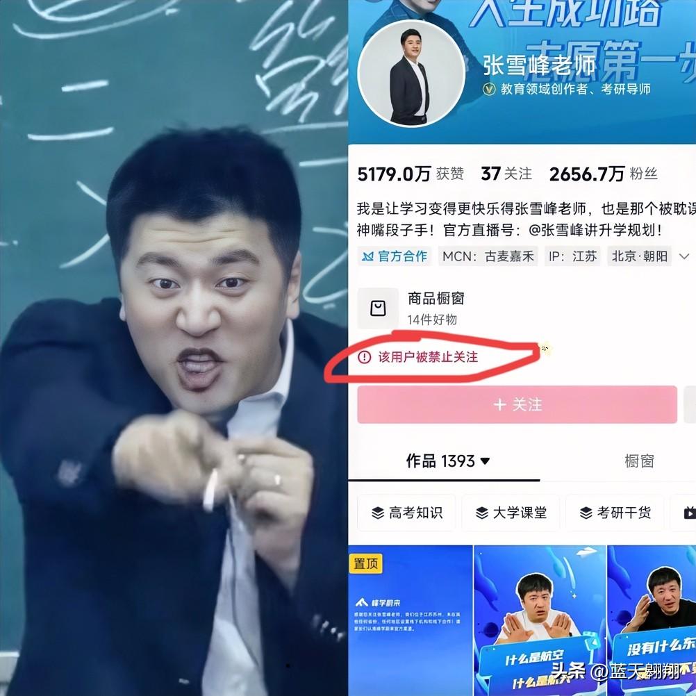 最近网上疯传张雪峰“被封”, 我跑去一看,好家伙,账号没封, 但被禁止关注了,这