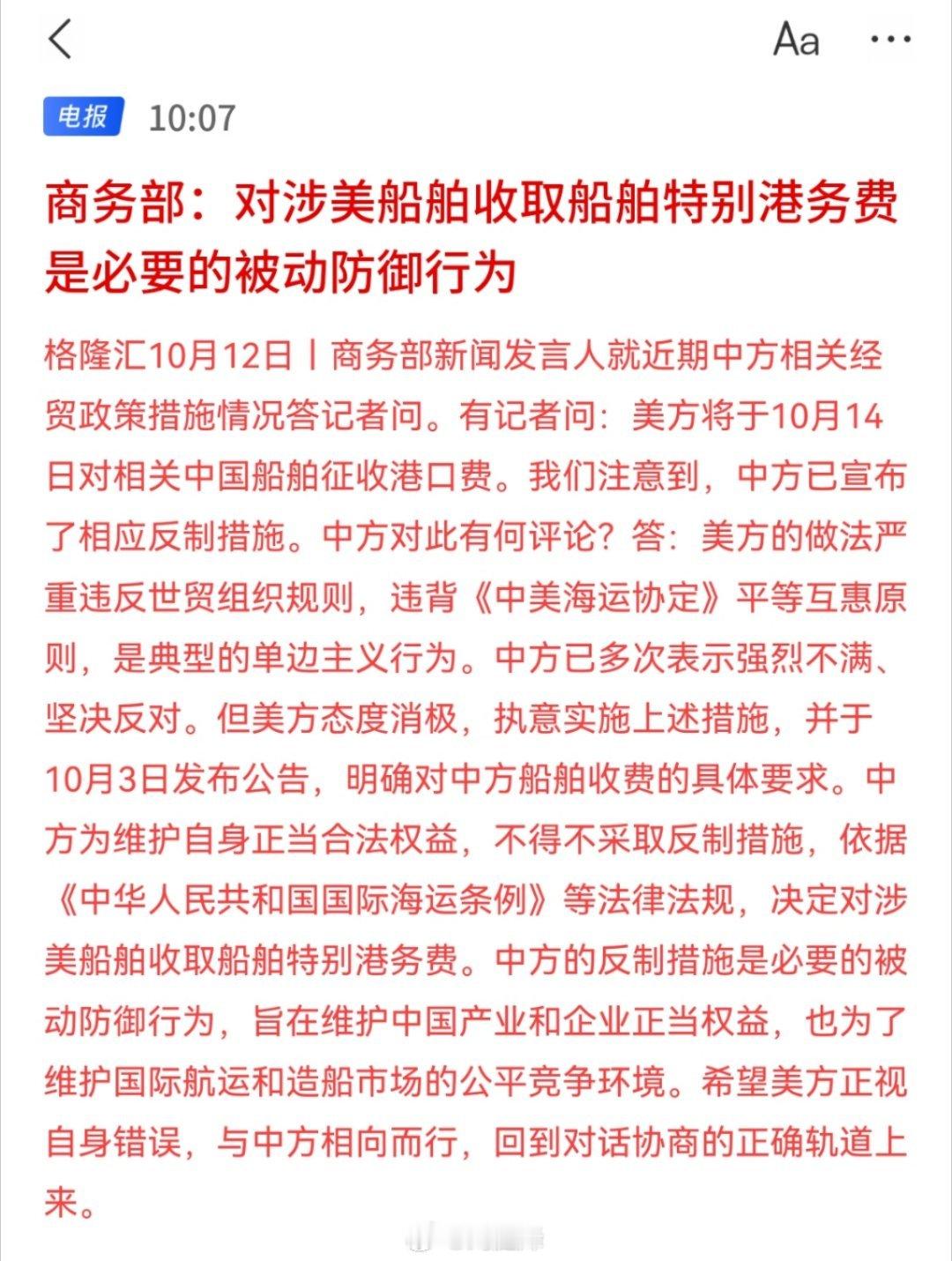 商务部回应中方相关经贸政策措施商务部:对涉美船舶收取船舶特别港务费是必要的被动防御行为