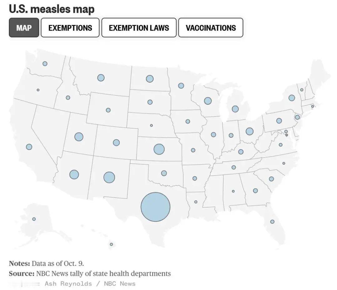 随着美国儿童疫苗接种率的下降,麻疹这种在过去25年里已在美国内被消灭的疾病,正在越来越多地找到易受感染的人群。南卡罗来纳州和明尼苏达州等地麻疹疫情已持续多时,并且还在扩大,数百名学生因感染麻疹而被迫隔离至少三周。据NBC调查发现,自2019年以来,全美超过四分之三的县和辖区的儿童疫苗接种率出现明显下滑。而在那些有儿童麻风腮疫苗接种数据的州中,有67%的州接种覆盖率不足以形成群体免疫。截至10月7日,美国疾病控制与预防中心(CDC)确认2025年全美共有1,563例麻疹病例,其中大多数与国内的疫情爆发有关,而非来自国际旅行输入。 图片来源于网络