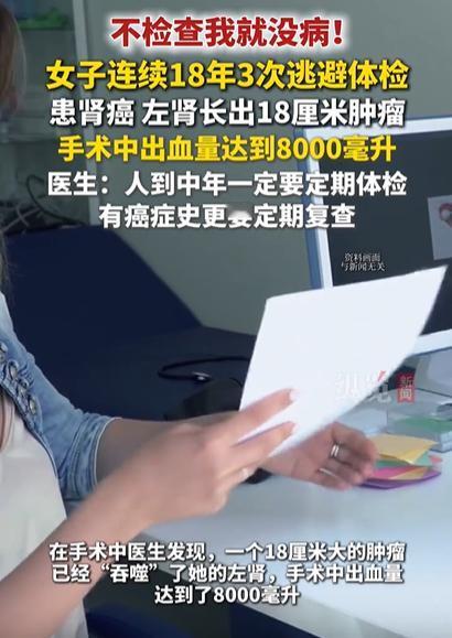 “不检查我就没病!”西安一女子连续18年3次逃避体检,结果连自己患肾癌都不知道,左肾长出18厘米肿瘤,对于之前拒绝查体,女子感到非常后悔,要是早早体检,也不至于受这罪!医生给她做了手,术中出血量达到8000毫升,医生提醒:人到中年一定要定期体检,有癌症史更要定期复查!   在长达18年的时间里,女子所在单位组织了三次体检,每一次她都找了各种理由拒绝,她的逻辑简单而脆弱:“不检查我就没病”。   这种典型的“鸵鸟心态”将头埋进沙子里,便以为危险不复存在,她害怕面对可能出现的坏消息,宁愿活在自我构建的“健康”假象中。   然而疾病并不会因为人的主观回避而停止发展,在她一次又一次地按下“暂停键”时,她体内的癌细胞却在疯狂地按下了“快进键”。   直到身体发出了无法再被忽视的警报,或许是持续的腰痛,无法解释的体重下降,她才终于走进了医院,检查结果如晴天霹雳,将她从自欺欺人的梦中彻底惊醒:她的左肾上,赫然长出了一个直径约18厘米的巨大肿瘤。   这个肿瘤几乎比她正常的肾脏还要大上一圈,像一个贪婪的寄生者,几乎完全吞噬了左肾,并可能已经侵犯了周围的组织,医生诊断其为肾癌,且已发展到了相当晚期的阶段。   随后的手术过程,堪称一场惊心动魄的战斗,手术后躺在病床上的女子,面对着虚弱的身体和漫长的康复期,终于流下了悔恨的泪水,她反复念叨着:“要是早早体检,也不至于受这罪!”   这句迟来的醒悟,是她用巨大的身体创伤和生命风险换来的,她所受的“罪”,不仅仅是手术台上的生死考验,更是术后可能面临的并发症生活质量下降,以及未来需要长期随访的心理和经济压力。   一个本可以通过早期微创手术轻松解决的问题,演变成了一场九死一生的浩劫,这其中的代价,远非“后悔”二字可以衡量。   对于此事网友们纷纷发表自己的看法,一位网友评论道:“这真是典型的‘无知者无畏’,但代价太惨重了,她逃避的不是体检,而是面对现实的责任,希望她的故事能让那些每年都找借口不体检的人,赶紧拿起电话预约”。   另一位网友则表示:“我觉得不能简单地指责她‘傻’,这背后反映的是一种普遍的‘健康焦虑’和对医疗体系的‘不信任感’,很多人害怕体检,是怕查出病后,面对的是高昂的治疗费用,漫长的治疗过程以及不确定的预后,这种恐惧是真实的,所以除了呼吁大家定期体检,我们的社会和医疗体系是不是也应该做得更多?”   总而言之,西安这位女子的遭遇,是一个令人心痛的悲剧,但更是一份价值千金的“公开课”,它用最极端的方式告诉我们,对健康的侥幸心理,是人生最大的风险投资,在疾病面前没有“如果”,只有“结果”和“后果”,定期体检不是一句可有可无的提醒,而是我们每个人都应认真对待的,与生命签订的一份“保险合同”。   对于女子的遭遇,大家有什么想说的? --------------------------------