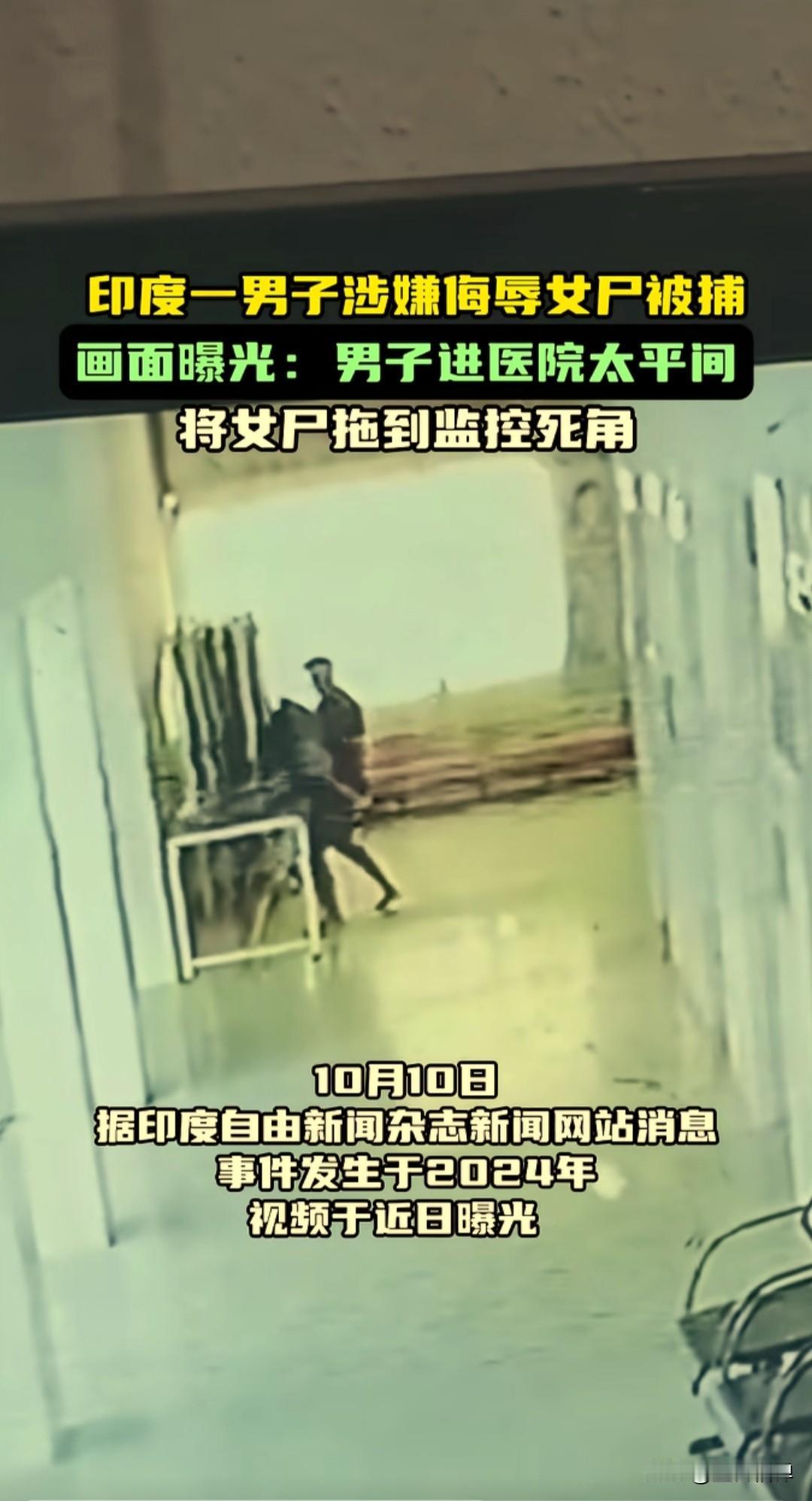 印度中央邦布尔汉地区一男子涉嫌侮辱尸体罪被捕,视频画面曝光,监控录像显示,该男子潜入一社区卫生中心停尸房。 将一名等待尸检的已故女性尸体拖入监控死角,并实施了侮辱行为,一段时间后又将尸体弃置担架附近。 2025年10月7日,事发地监控录像在社交媒体上广大传播,引发公众关注。事发时间在2024年4月 18日凌晨6点45分左右。 警方在视频曝光后迅速行动,逮捕了这名25岁的嫌疑人Nilesh Bhilala,并依据印度刑法第297条(侮辱尸体)提起诉讼。 来源:搜狐新闻客户端