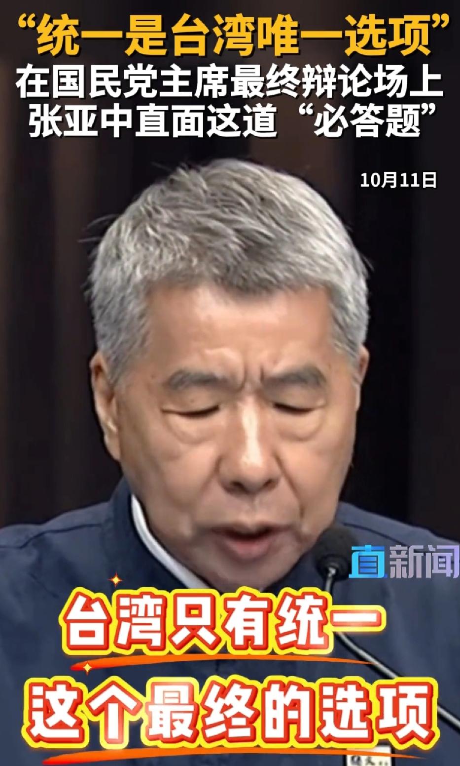 张亚中正面回应统一:台湾只有统一这个最终选项!国民党终于出了一个明白人了!没准真能成为第二个“张学良”, 张亚中拿出“九二共识”来直面回答,“九二共识”中有两个共识,一个是遵守一个中国原则另外一个是谋求国家统一! 台湾作为中国整体的一部分,是不容许分裂出去的,台湾更没有“台独”和“永久维持现状”这两种可能! 张亚中教授作为一个资深国民党,清楚国民党以往的毛病和缺点,也知道台湾人民最大的利益和福祉在于统一,已经一半白头发的了,还在为国民党正名,为台湾人民争取,值得敬佩!