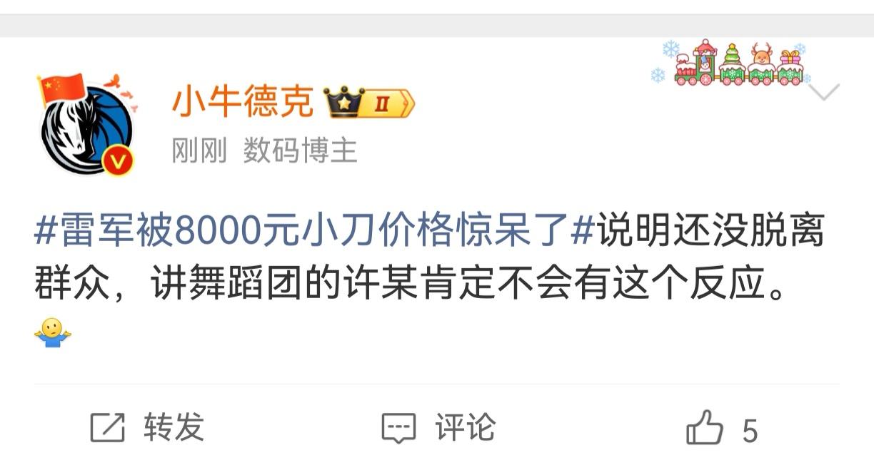 这种博主舔的是真的有水平啊!雷军被8000小刀价格惊呆,冲上了热搜,我看很多人在讨论小刀本身。 但是,就是在人群中能够看到有的舔功深厚的自媒体博主。 这个人说:说明还没脱离群众,舞蹈团的许某肯定不会有这个反应。 咱也不懂这样清奇的角度是想出来的,又或者这已经属于他们本能了?可以在任何细枝末节出找到可以夸和可以喷的地方! 这就叫一个自媒体的基本素养!雷军